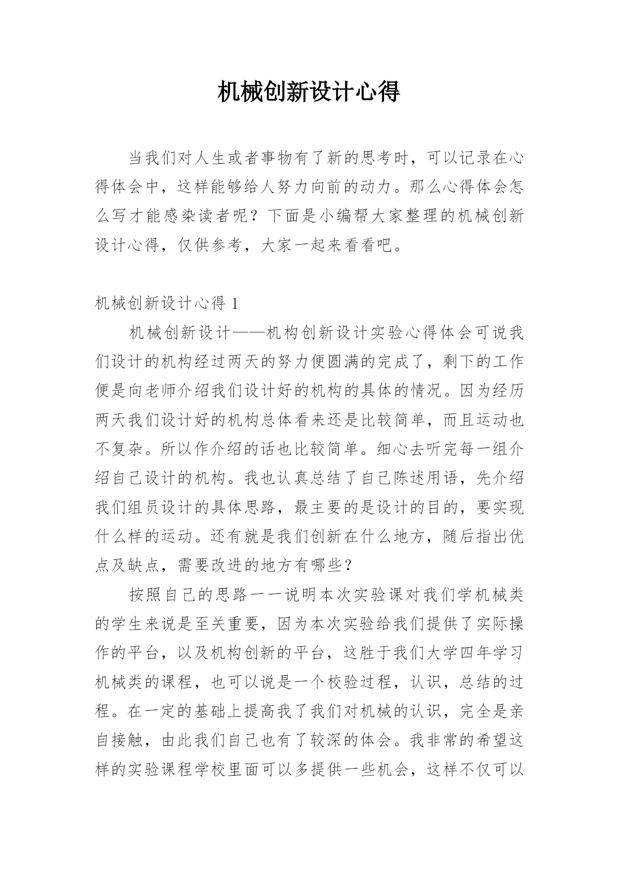 机械创新设计心得当我们对人生或者事物有了新的思考时,可以记录在心得体会中,这样能够给人努力向前的动力。那么心得体会怎么写才能感染读者呢?下面是小编帮大家整理的机械创新设计心得,仅供参考,大家一起来看看吧。机械创新设计心得1机械创新设计——机构创新设计实验心得体会可说我们设计的机构经过两天的努力便圆满的完成了,剩下的工作便是向老师介绍我们设计好的机构的具体的情况。因为经历两天我们设计好的机构总体看来还是比较简单,而且运动也不复杂。所以作介绍的话也比较简单。细心去听完每一组介绍自己设计的机构。我也认真总结了自