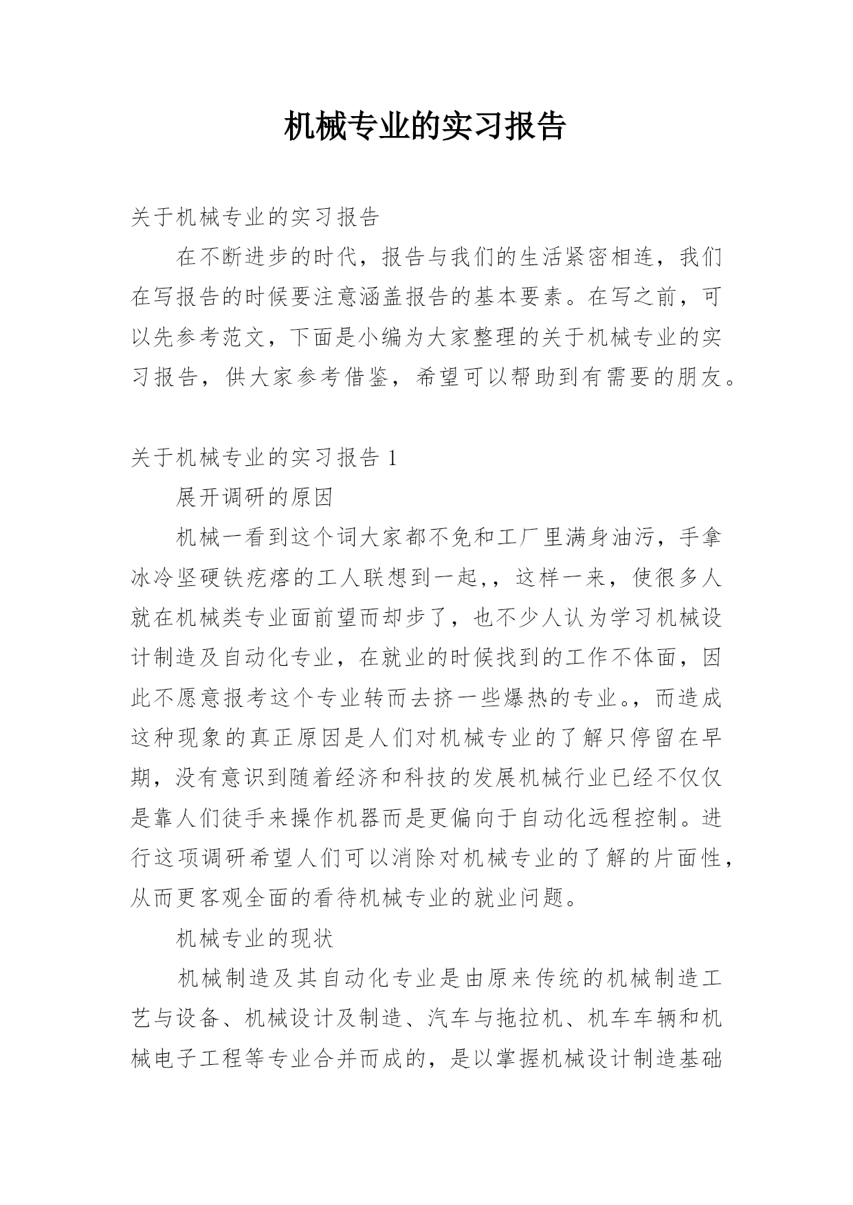 机械专业的实习报告关于机械专业的实习报告在不断进步的时代,报告与我们的生活紧密相连,我们在写报告的时候要注意涵盖报告的基本要素。在写之前,可以先参考范文,下面是小编为大家整理的关于机械专业的实习报告,供大家参考借鉴,希望可以帮助到有需要的朋友。关于机械专业的实习报告1展开调研的原因机械一看到这个词大家都不免和工厂里满身油污,手拿冰冷坚硬铁疙瘩的工人联想到一起,,这样一来,使很多人就在机械类专业面前望而却步了,也不少人认为学习机械设计制造及自动化专业,在就业的时候找到的工作不体面,因此不愿意报考这个专业转而