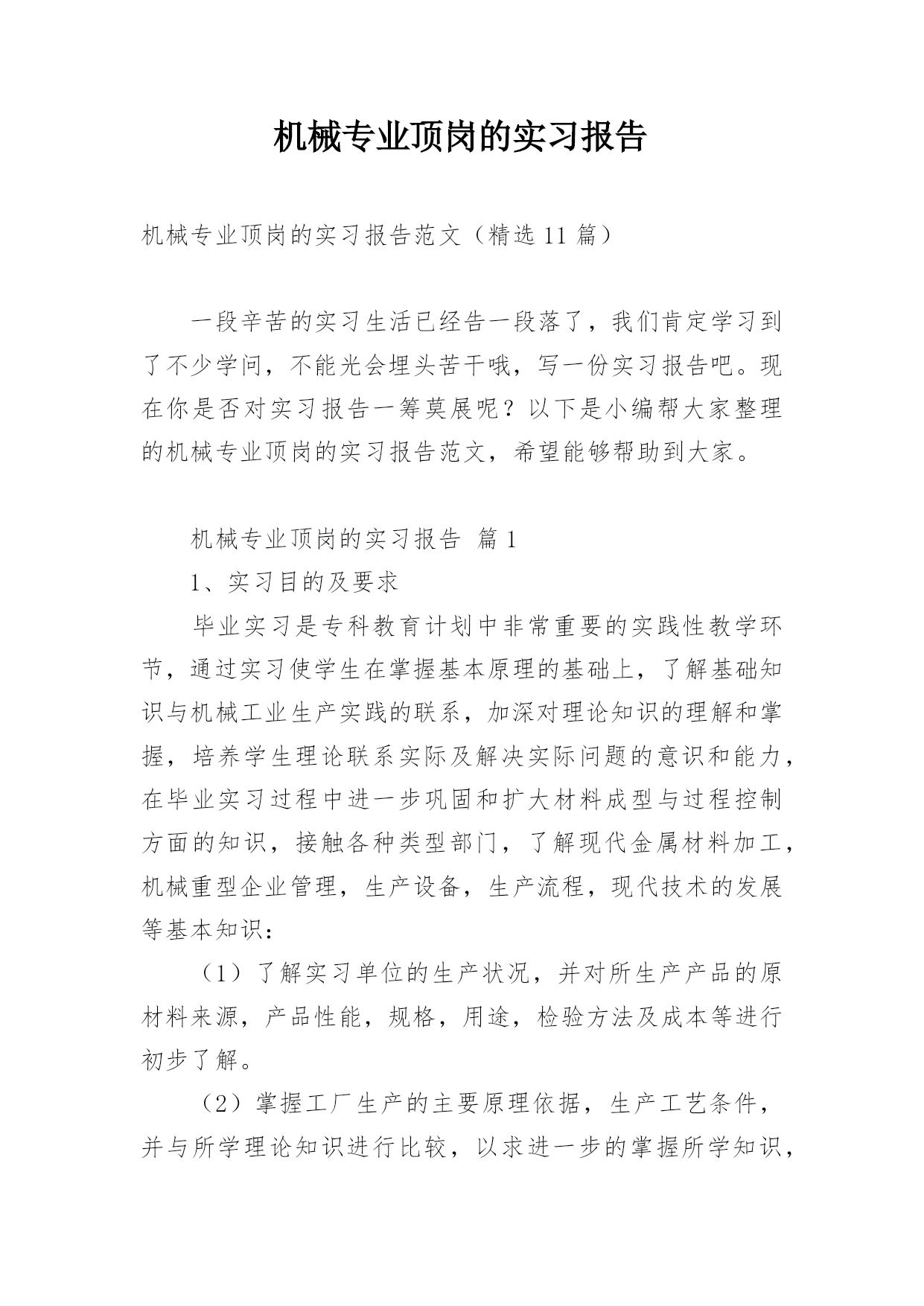 机械专业顶岗的实习报告机械专业顶岗的实习报告范文(精选11篇)一段辛苦的实习生活已经告一段落了,我们肯定学习到了不少学问,不能光会埋头苦干哦,写一份实习报告吧。现在你是否对实习报告一筹莫展呢?以下是小编帮大家整理的机械专业顶岗的实习报告范文,希望能够帮助到大家。机械专业顶岗的实习报告篇11、实习目的及要求毕业实习是专科教育计划中非常重要的实践性教学环节,通过实习使学生在掌握基本原理的基础上,了解基础知识与机械工业生产实践的联系,加深对理论知识的理解和掌握,培养学生理论联系实际及解决实际问题的意识和能力,在