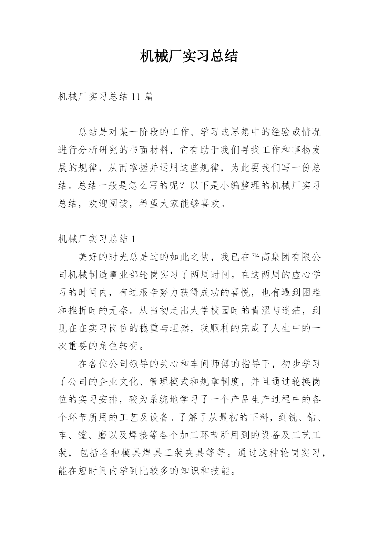 机械厂实习总结机械厂实习总结11篇总结是对某一阶段的工作、学习或思想中的经验或情况进行分析研究的书面材料,它有助于我们寻找工作和事物发展的规律,从而掌握并运用这些规律,为此要我们写一份总结。总结一般是怎么写的呢?以下是小编整理的机械厂实习总结,欢迎阅读,希望大家能够喜欢。机械厂实习总结1美好的时光总是过的如此之快,我已在平高集团有限公司机械制造事业部轮岗实习了两周时间。在这两周的虚心学习的时间内,有过艰辛努力获得成功的喜悦,也有遇到困难和挫折时的无奈。从当初走出大学校园时的青涩与迷茫,到现在在实习岗位的稳