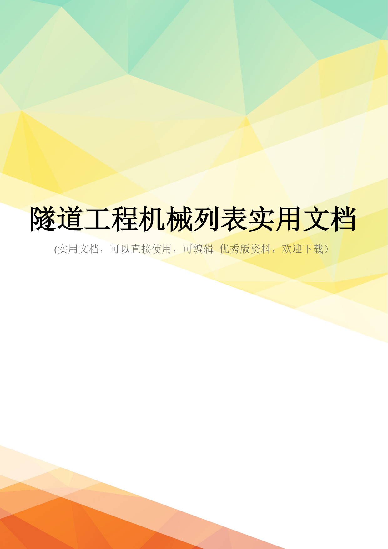 隧道工程机械列表实用文档(实用文档,可以直接使用,可编辑优秀版资料,欢迎下载)隧道施工机械凿岩台车凿岩台车是吧几台凿岩机支架安装在同一台车上,也可同时进行多个钻眼的施工。可作为其他工序的工作台。凿岩机台车一般用于地质条件较好,基本不要临时支护的大断面的隧道工程。其特点是劳动强度低,钻孔速度高,钻孔平均速度达20~30(cm/min),钻杆长,可钻深孔而无须接杆,定向性好,机动性好。分类:台车行走机构有轨道、履带及轮胎式三种.国产凿岩台车以轨道及轮胎式较多。轨行式台车车体一般为门架式,故常称门架式凿岩台车。