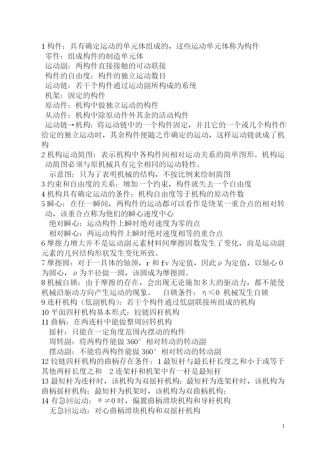 1构件:具有确定运动的单元体组成的,这些运动单元体称为构件零件:组成构件的制造单元体运动副:两构件直接接触的可动联接构件的自由度:构件的独立运动数目运动链:若干个构件通过运动副所构成的系统机架:固定的构件原动件:机构中做独立运动的构件从动件:机构中除原动件外其余的活动构件运动链→机构:将运动链中的一个构件固定,并且它的一个或几个构件作给定的独立运动时,其余构件便随之作确定的运动,这样运动链就成了机构2机构运动简图:表示机构中各构件间相对运动关系的简单图形。机构运动简图必须与原机械具有完全相同的运动特性。示