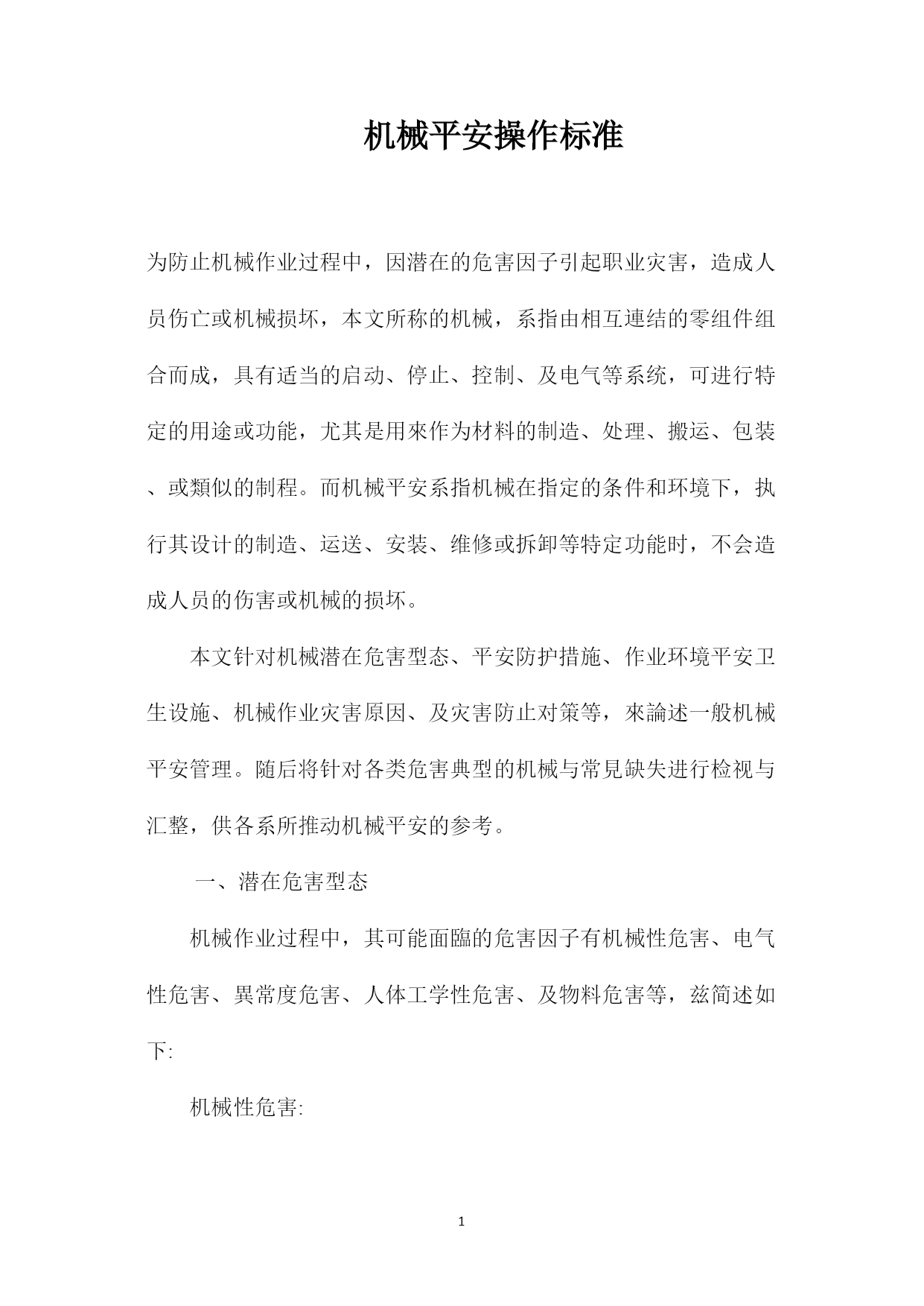 PAGEPAGE4机械平安操作标准为防止机械作业过程中,因潜在的危害因子引起职业灾害,造成人员伤亡或机械损坏,本文所称的机械,系指由相互連结的零组件组合而成,具有适当的启动、停止、控制、及电气等系统,可进行特定的用途或功能,尤其是用來作为材料的制造、处理、搬运、包装、或類似的制程。而机械平安系指机械在指定的条件和环境下,执行其设计的制造、运送、安装、维修或拆卸等特定功能时,不会造成人员的伤害或机械的损坏。本文针对机械潜在危害型态、平安防护措施、作业环境平安卫生设施、机械作业灾害原因、及灾害防止