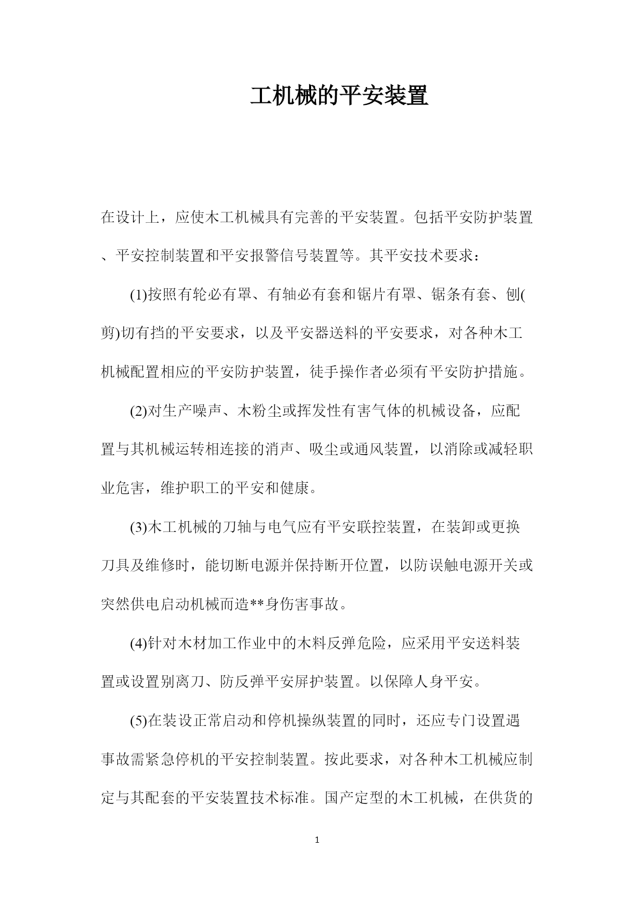 PAGEPAGE5工机械的平安装置在设计上,应使木工机械具有完善的平安装置。包括平安防护装置、平安控制装置和平安报警信号装置等。其平安技术要求:(1)按照有轮必有罩、有轴必有套和锯片有罩、锯条有套、刨(剪)切有挡的平安要求,以及平安器送料的平安要求,对各种木工机械配置相应的平安防护装置,徒手操作者必须有平安防护措施。(2)对生产噪声、木粉尘或挥发性有害气体的机械设备,应配置与其机械运转相连接的消声、吸尘或通风装置,以消除或减轻职业危害,维护职工的平安和健康。(3)木工机械的刀轴与电气应有平安联
