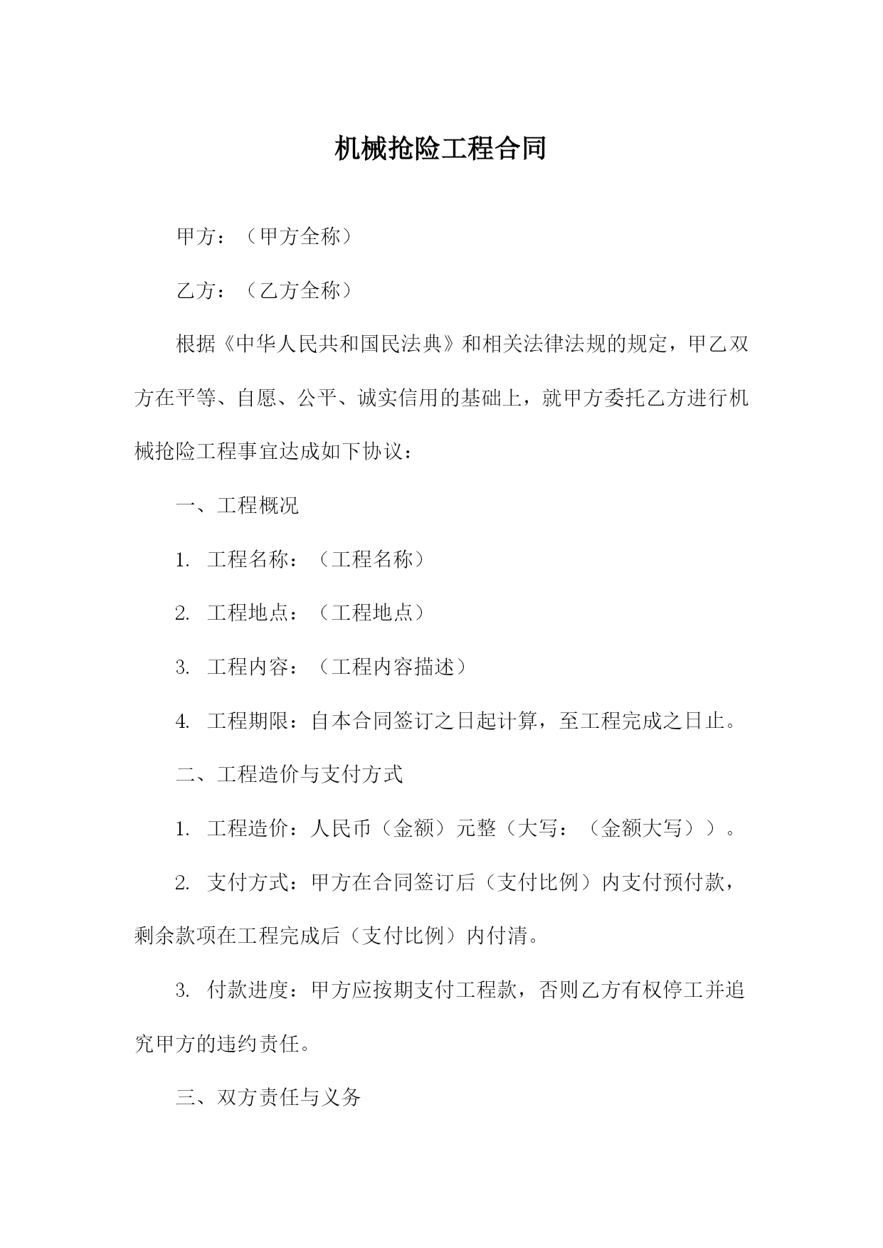 机械抢险工程合同甲方:(甲方全称)乙方:(乙方全称)根据《中华人民共和国民法典》和相关法律法规的规定,甲乙双方在平等、自愿、公平、诚实信用的基础上,就甲方委托乙方进行机械抢险工程事宜达成如下协议:一、工程概况1.工程名称:(工程名称)2.工程地点:(工程地点)3.工程内容:(工程内容描述)4.工程期限:自本合同签订之日起计算,至工程完成之日止。二、工程造价与支付方式1.工程造价:人民币(金额)元整(大写:(金额大写))。2.支付方式:甲方在合同签订后(支付比例)内支付预付款,剩余款项在工程完成后(支付比例