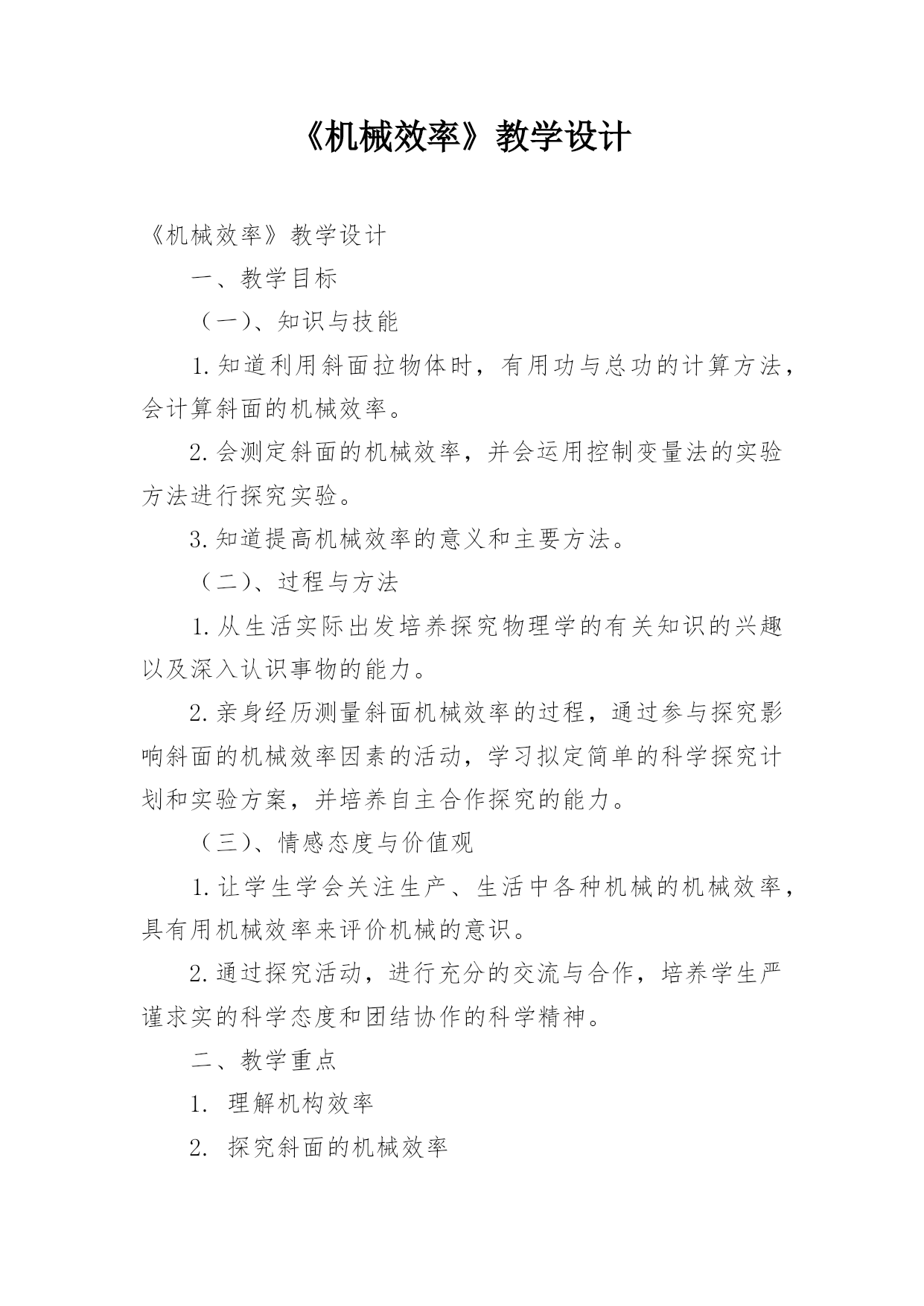 《机械效率》教学设计《机械效率》教学设计一、教学目标(一)、知识与技能1.知道利用斜面拉物体时,有用功与总功的计算方法,会计算斜面的机械效率。2.会测定斜面的机械效率,并会运用控制变量法的实验方法进行探究实验。3.知道提高机械效率的意义和主要方法。(二)、过程与方法1.从生活实际出发培养探究物理学的有关知识的兴趣以及深入认识事物的能力。2.亲身经历测量斜面机械效率的过程,通过参与探究影响斜面的机械效率因素的活动,学习拟定简单的科学探究计划和实验方案,并培养自主合作探究的能力。(三)、情感态度与价值观1.让