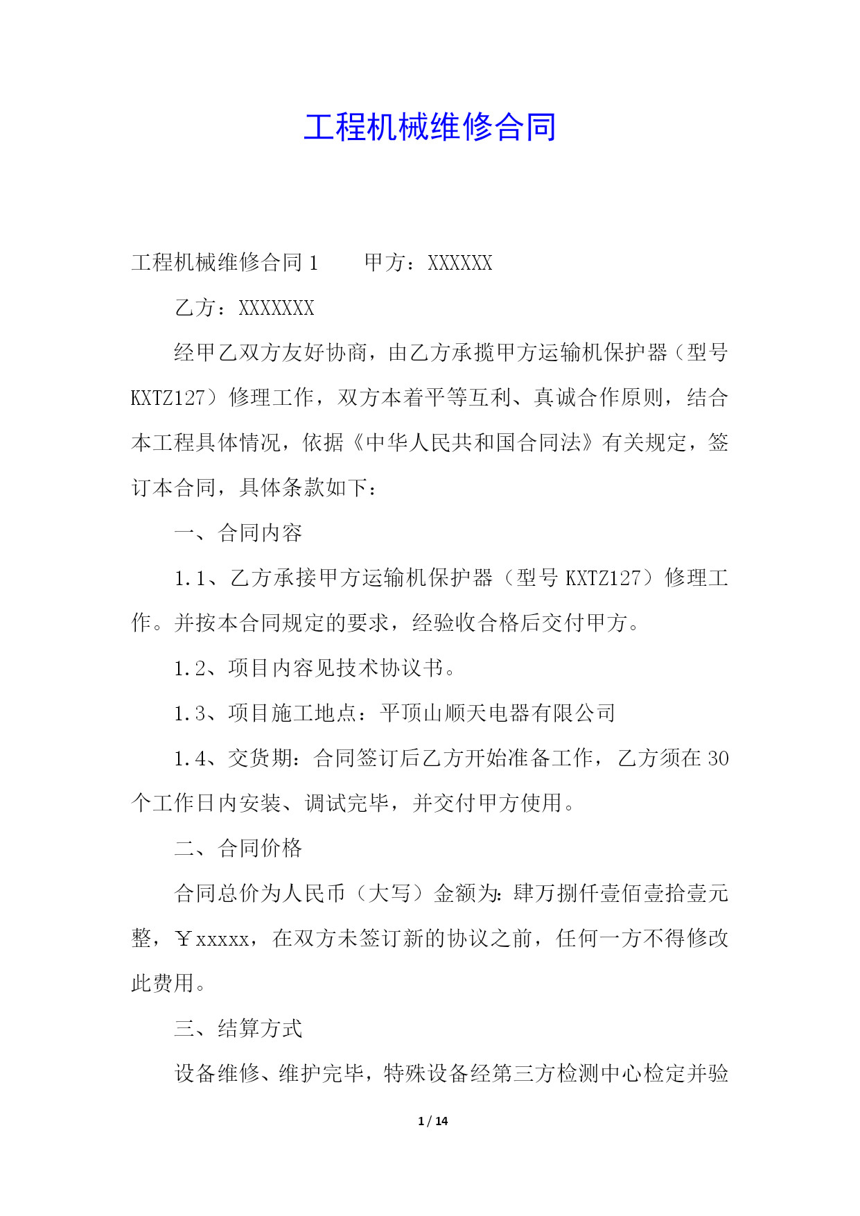 PAGE14/NUMPAGES14工程机械维修合同工程机械维修合同1甲方:XXXXXX乙方:XXXXXXX经甲乙双方友好协商,由乙方承揽甲方运输机保护器(型号KXTZ127)修理工作,双方本着平等互利、真诚合作原则,结合本工程具体情况,依据《中华人民共和国合同法》有关规定,签订本合同,具体条款如下:一、合同内容1.1、乙方承接甲方运输机保护器(型号KXTZ127)修理工作。并按本合同规定的要求,经验收合格后交付甲方。1.2、项目内容见技术协议书。1.3、项目施工地点:平顶山顺天电器有限公司1.