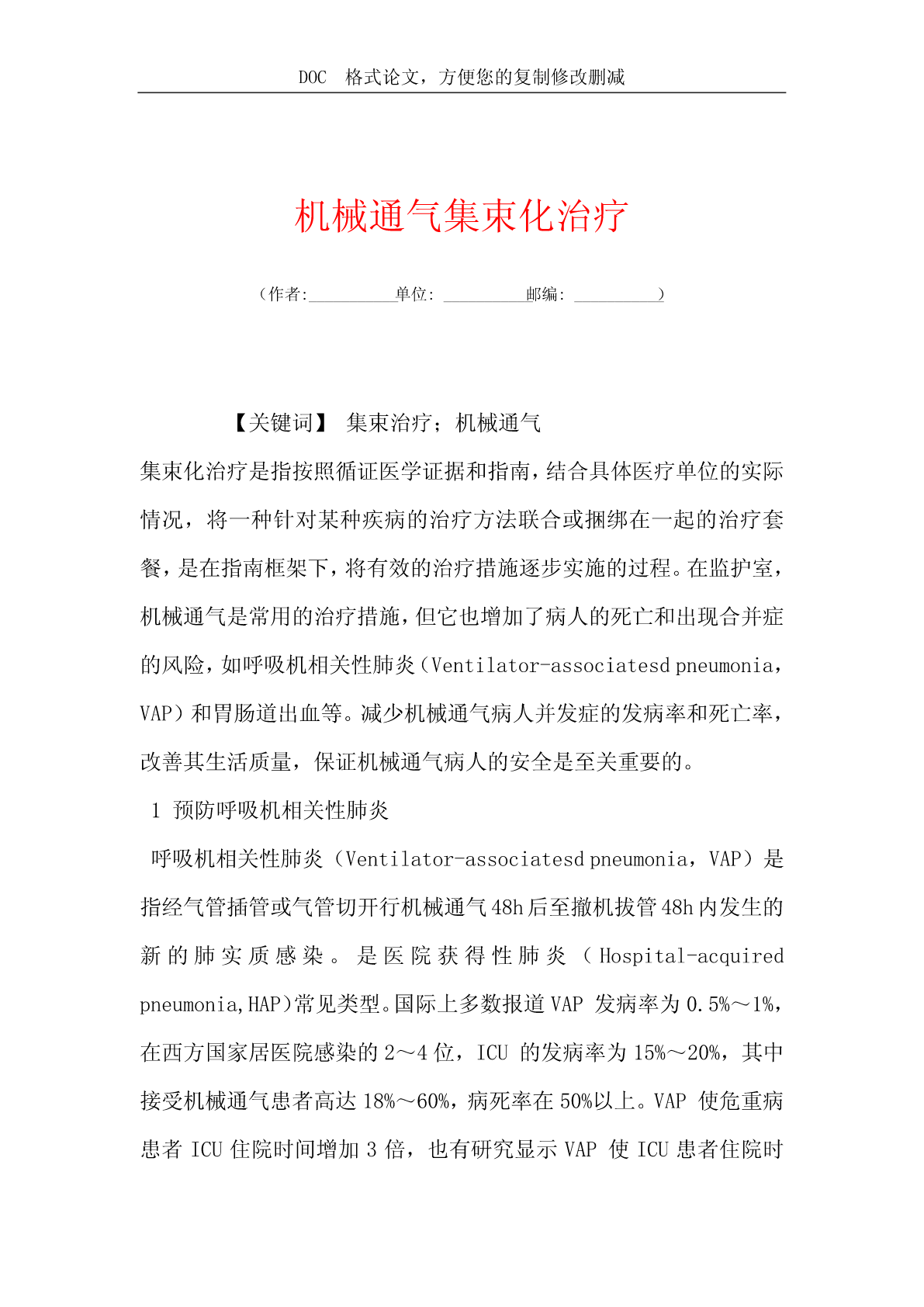 DOC格式论文,方便您的复制修改删减机械通气集束化治疗(作者:___________单位:___________邮编:___________)【关键词】集束治疗;机械通气集束化治疗是指按照循证医学证据和指南,结合具体医疗单位的实际情况,将一种针对某种疾病的治疗方法联合或捆绑在一起的治疗套餐,是在指南框架下,将有效的治疗措施逐步实施的过程。在监护室,机械通气是常用的治疗措施,但它也增加了病人的死亡和出现合并症的风险,如呼吸机相关性肺炎(Ventilator-associatesdpneumonia,VAP)