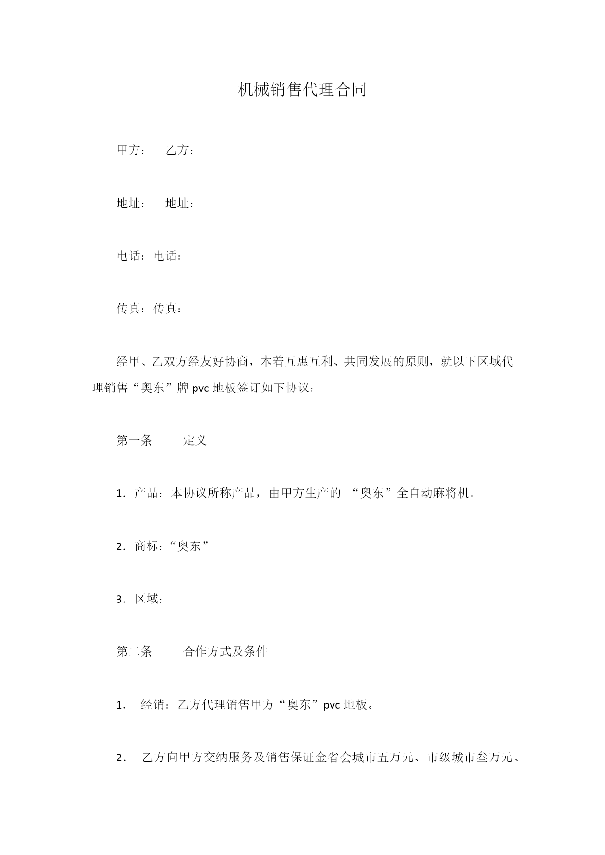 机械销售代理合同甲方:乙方:地址:地址:电话:电话:传真:传真:经甲、乙双方经友好协商,本着互惠互利、共同发展的原则,就以下区域代理销售“奥东”牌pvc地板签订如下协议:第一条定义1.产品:本协议所称产品,由甲方生产的“奥东”全自动麻将机。2.商标:“奥东”3.区域:第二条合作方式及条件1.经销:乙方代理销售甲方“奥东”pvc地板。2.乙方向甲方交纳服务及销售保证金省会城市五万元、市级城市叁万元、县级城市贰万元整。合同期满,无售后服务投诉,甲方一次退还此保证金。3.甲方向乙方提供免费的售后服务人员技术培训