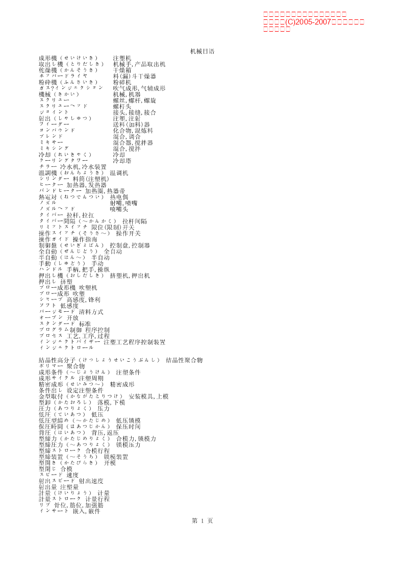 机械日语成形機(せいけいき)注塑机取出し機(とりだしき)机械手,产品取出机乾燥機(かんそうき)干燥箱ホッパードライヤ料(漏)斗干燥器粉砕機(ふんさいき)粉碎机ガス?インジェクション吹气成形,气辅成形機械(きかい)机械,机器スクリュー螺丝,螺杆,螺旋スクリューヘッド螺杆头ジョイント接头,接缝,接合射出(しゃしゅつ)注塑,注射フィーダー送料(加料)器コンパウンド化合物,混炼料ブレンド混合,调合ミキサー混合器,搅拌器ミキシング混合,搅拌冷却(れいきゃく)冷却クーリングタワー冷却塔チラー冷水机,冷水装置温調機(お