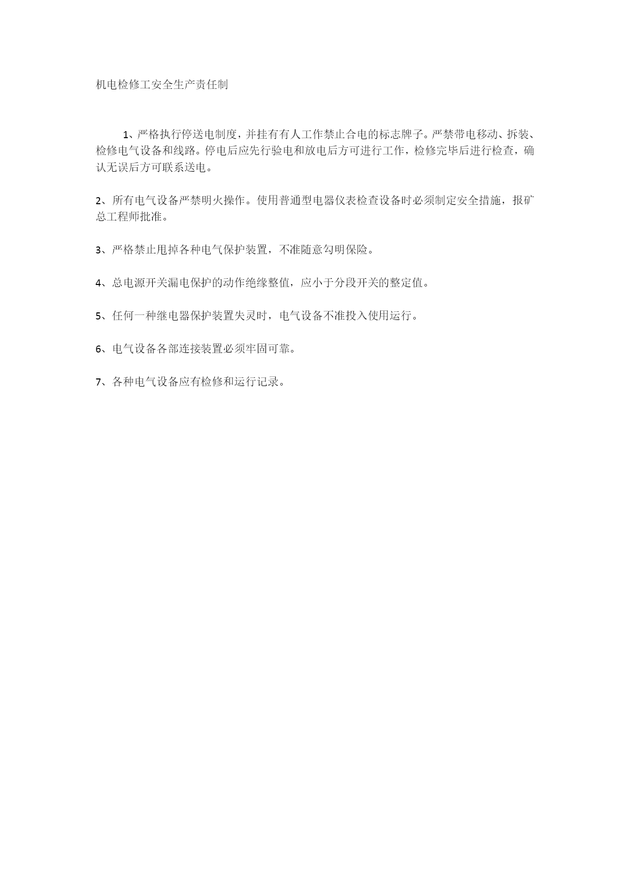 机电检修工安全生产责任制1、严格执行停送电制度,并挂有有人工作禁止合电的标志牌子。严禁带电移动、拆装、检修电气设备和线路。停电后应先行验电和放电后方可进行工作,检修完毕后进行检查,确认无误后方可联系送电。2、所有电气设备严禁明火操作。使用普通型电器仪表检查设备时必须制定安全措施,报矿总工程师批准。3、严格禁止甩掉各种电气保护装置,不准随意勾明保险。4、总电源开关漏电保护的动作绝缘整值,应小于分段开关的整定值。5、任何一种继电器保护装置失灵时,电气设备不准投入使用运行。6、电气设备各部连接装置必须牢固可靠。