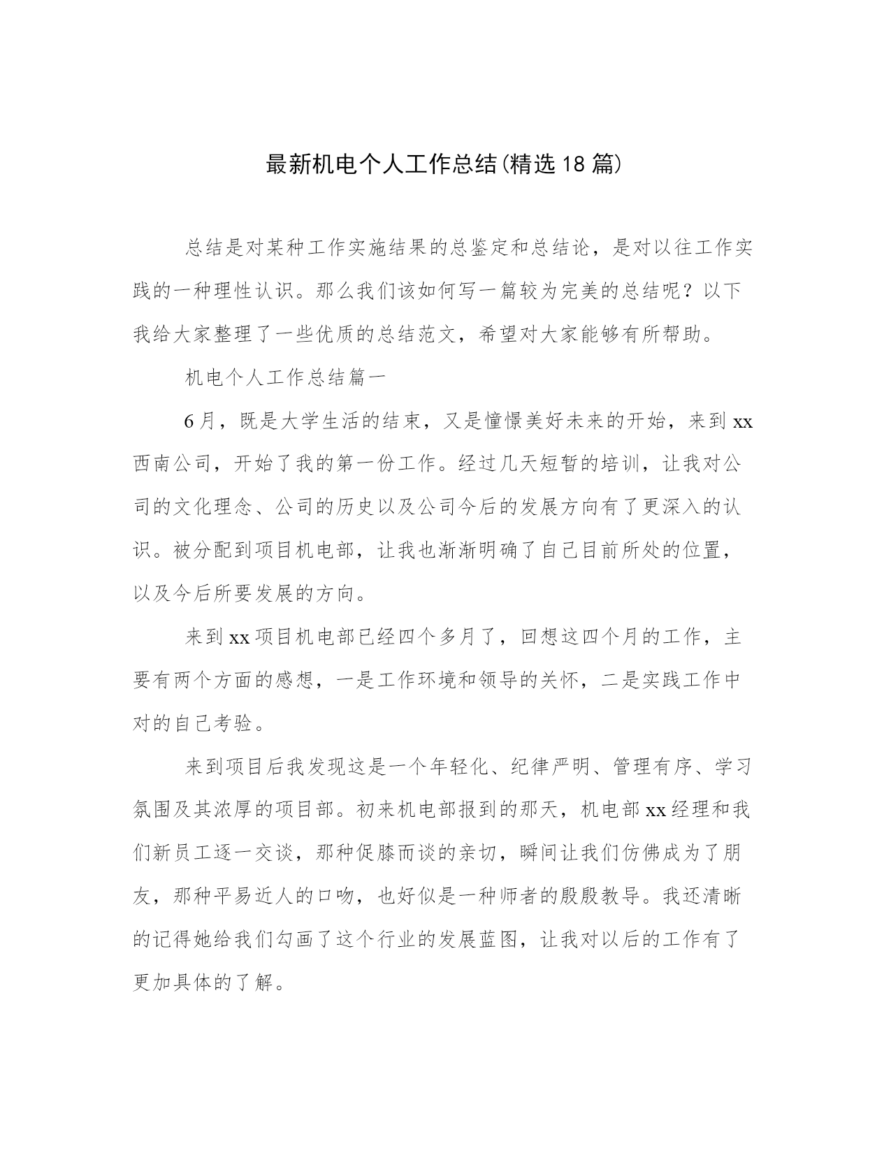 最新机电个人工作总结(精选18篇).docx