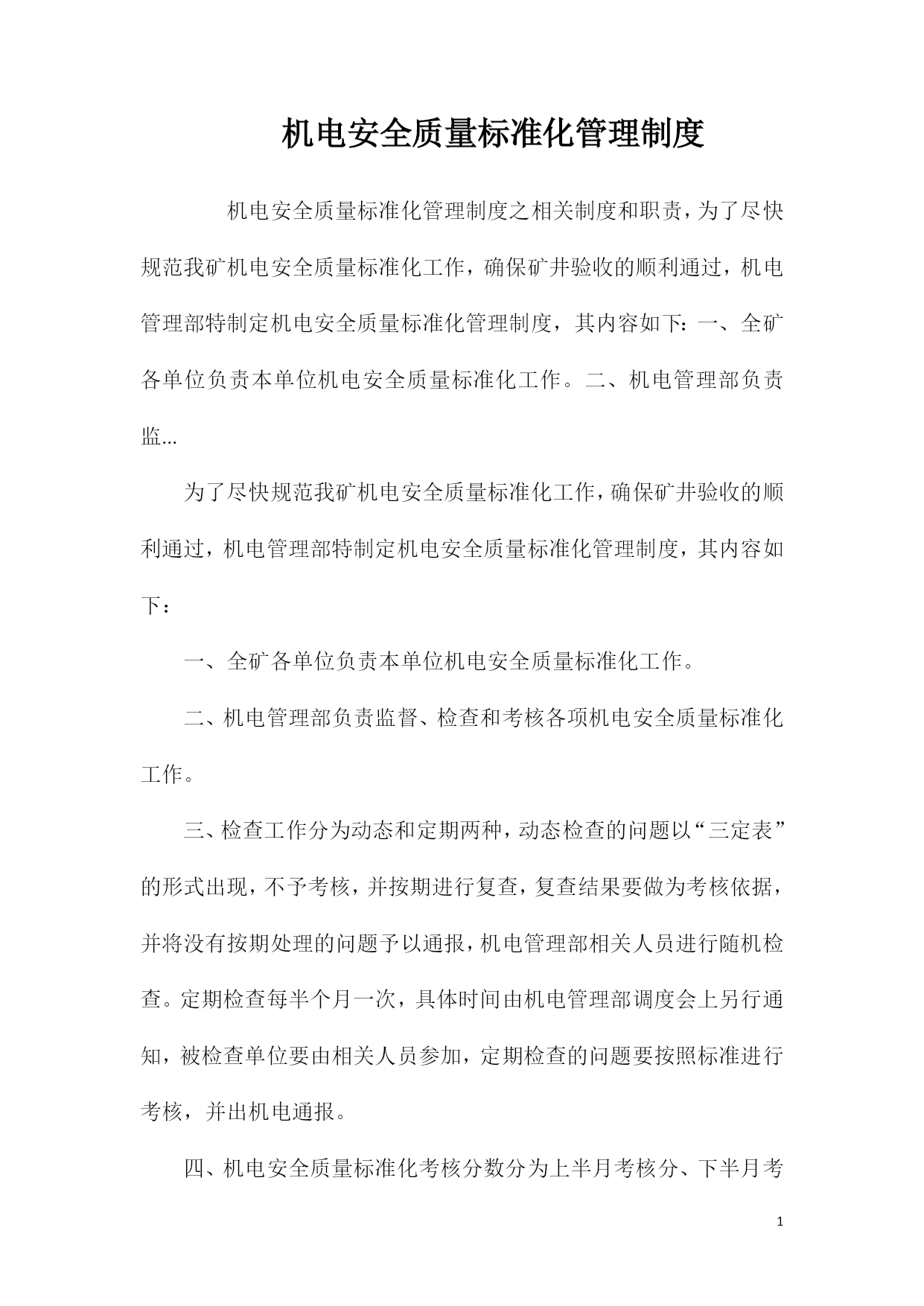 PAGEPAGE6机电安全质量标准化管理制度机电安全质量标准化管理制度之相关制度和职责,为了尽快规范我矿机电安全质量标准化工作,确保矿井验收的顺利通过,机电管理部特制定机电安全质量标准化管理制度,其内容如下:一、全矿各单位负责本单位机电安全质量标准化工作。二、机电管理部负责监...为了尽快规范我矿机电安全质量标准化工作,确保矿井验收的顺利通过,机电管理部特制定机电安全质量标准化管理制度,其内容如下:一、全矿各单位负责本单位机电安全质量标准化工作。二、机电管理部负责监督、检查和考核各项机电安全质