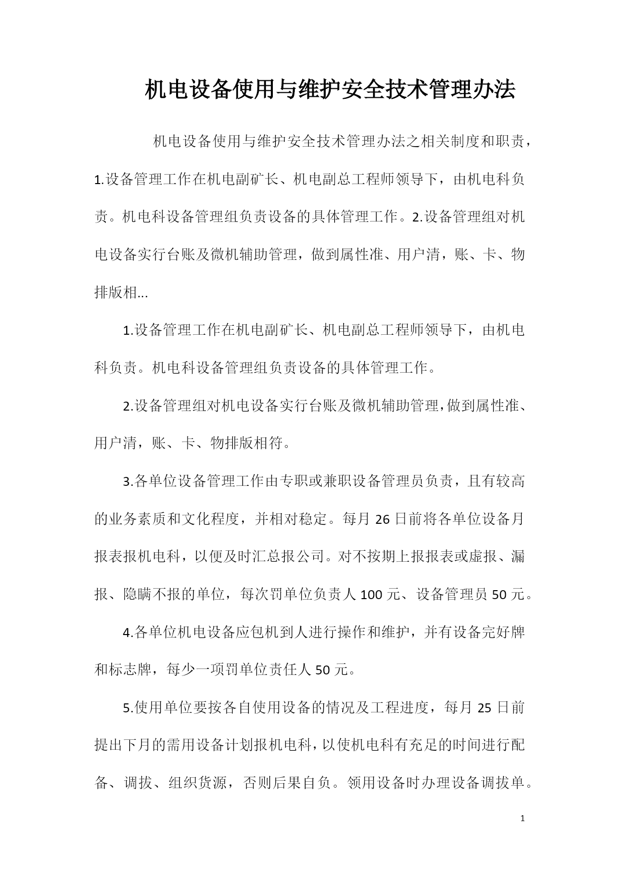 PAGEPAGE17机电设备使用与维护安全技术管理办法机电设备使用与维护安全技术管理办法之相关制度和职责,1.设备管理工作在机电副矿长、机电副总工程师领导下,由机电科负责。机电科设备管理组负责设备的具体管理工作。2.设备管理组对机电设备实行台账及微机辅助管理,做到属性准、用户清,账、卡、物排版相...1.设备管理工作在机电副矿长、机电副总工程师领导下,由机电科负责。机电科设备管理组负责设备的具体管理工作。2.设备管理组对机电设备实行台账及微机辅助管理,做到属性准、用户清,账、卡、物排版相符。3