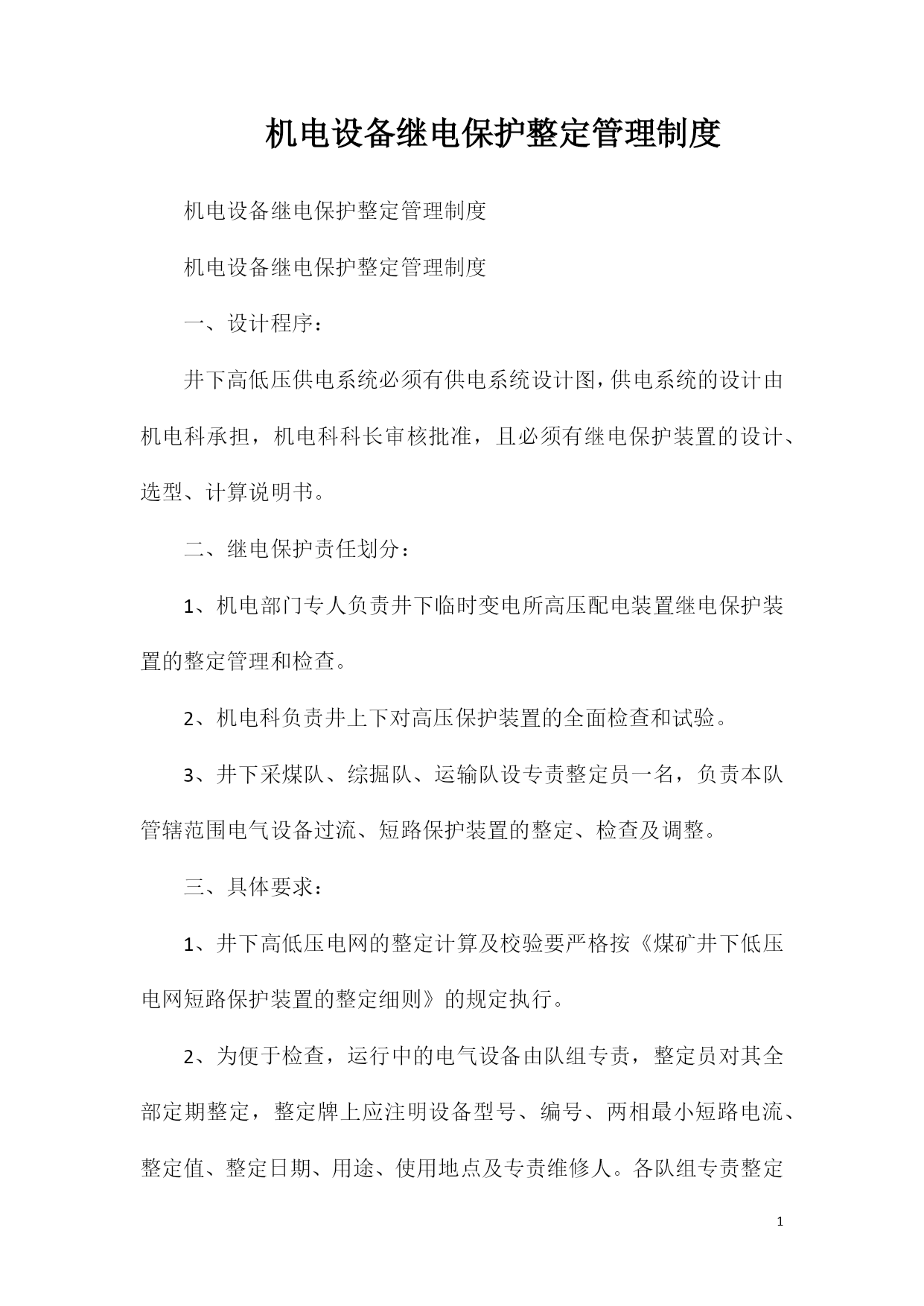 PAGEPAGE18机电设备继电保护整定管理制度机电设备继电保护整定管理制度机电设备继电保护整定管理制度一、设计程序:井下高低压供电系统必须有供电系统设计图,供电系统的设计由机电科承担,机电科科长审核批准,且必须有继电保护装置的设计、选型、计算说明书。二、继电保护责任划分:1、机电部门专人负责井下临时变电所高压配电装置继电保护装置的整定管理和检查。2、机电科负责井上下对高压保护装置的全面检查和试验。3、井下采煤队、综掘队、运输队设专责整定员一名,负责本队管辖范围电气设备过流、短路保护装置的整定