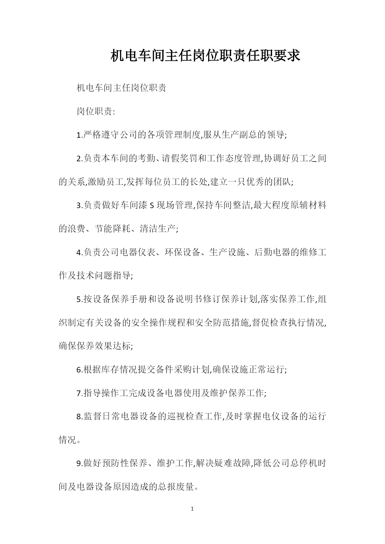 PAGEPAGE7机电车间主任岗位职责任职要求机电车间主任岗位职责岗位职责:1.严格遵守公司的各项管理制度,服从生产副总的领导;2.负责本车间的考勤、请假奖罚和工作态度管理,协调好员工之间的关系,激励员工,发挥每位员工的长处,建立一只优秀的团队;3.负责做好车间漆S现场管理,保持车间整洁,最大程度原辅材料的浪费、节能降耗、清洁生产;4.负责公司电器仪表、环保设备、生产设施、后勤电器的维修工作及技术问题指导;5.按设备保养手册和设备说明书修订保养计划,落实保养工作,组织制定有关设备的安全操作规程