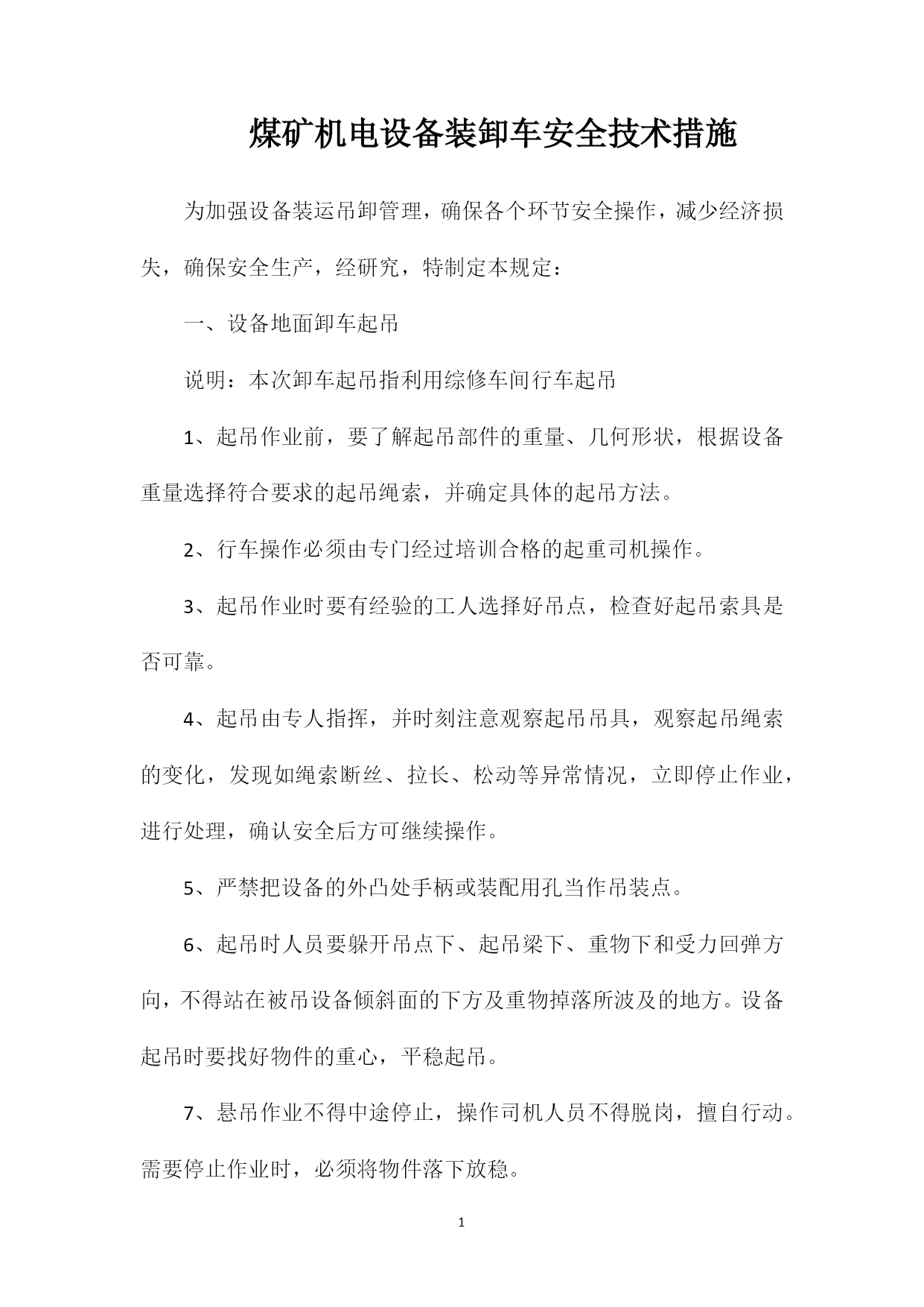 PAGEPAGE3煤矿机电设备装卸车安全技术措施为加强设备装运吊卸管理,确保各个环节安全操作,减少经济损失,确保安全生产,经研究,特制定本规定:一、设备地面卸车起吊说明:本次卸车起吊指利用综修车间行车起吊1、起吊作业前,要了解起吊部件的重量、几何形状,根据设备重量选择符合要求的起吊绳索,并确定具体的起吊方法。2、行车操作必须由专门经过培训合格的起重司机操作。3、起吊作业时要有经验的工人选择好吊点,检查好起吊索具是否可靠。4、起吊由专人指挥,并时刻注意观察起吊吊具,观察起吊绳索的变化,发现如绳索