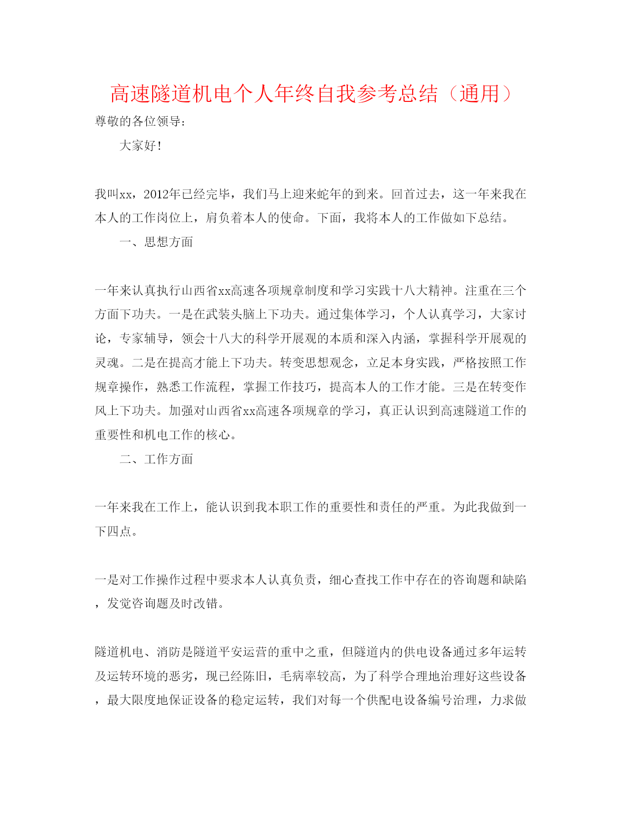 高速隧道机电个人年终自我参考总结(通用)尊敬的各位领导:大家好!我叫xx,2012年已经完毕,我们马上迎来蛇年的到来。回首过去,这一年来我在本人的工作岗位上,肩负着本人的使命。下面,我将本人的工作做如下总结。一、思想方面一年来认真执行山西省xx高速各项规章制度和学习实践十八大精神。注重在三个方面下功夫。一是在武装头脑上下功夫。通过集体学习,个人认真学习,大家讨论,专家辅导,领会十八大的科学开展观的本质和深入内涵,掌握科学开展观的灵魂。二是在提高才能上下功夫。转变思想观念,立足本身实践,严格按照工作规章操作