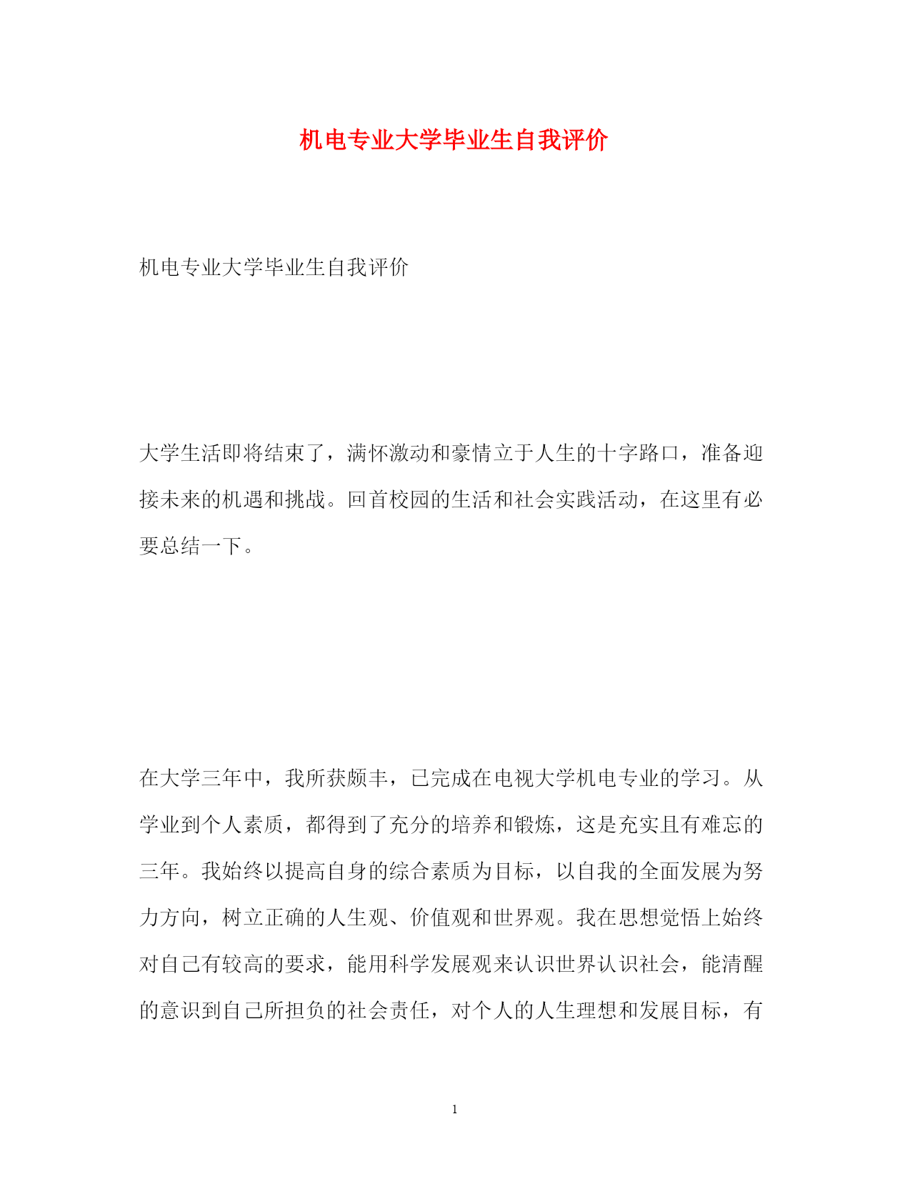 此资料由网络收集而来,如有侵权请告知上传者立即删除。资料共分享,我们负责传递知识。PAGEPAGE4机电专业大学毕业生自我评价机电专业大学毕业生自我评价大学生活即将结束了,满怀激动和豪情立于人生的十字路口,准备迎接未来的机遇和挑战。回首校园的生活和社会实践活动,在这里有必要总结一下。在大学三年中,我所获颇丰,已完成在电视大学机电专业的学习。从学业到个人素质,都得到了充分的培养和锻炼,这是充实且有难忘的三年。我始终以提高自身的综合素质为目标,以自我的全面发展为努力方向,树立正确的人生观、价值观和