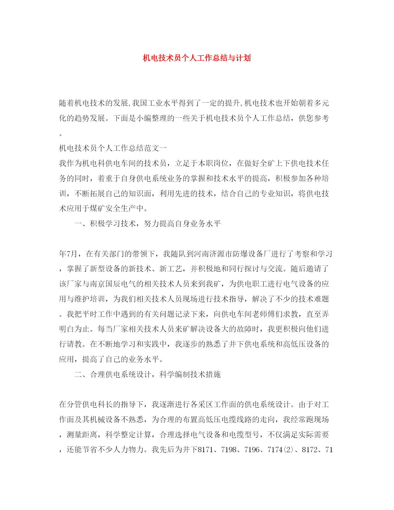 此资料由网络收集而来,如有侵权请告知上传者立即删除。资料共分享,我们负责传递知识。机电技术员个人工作总结与计划随着机电技术的发展,我国工业水平得到了一定的提升,机电技术也开始朝着多元化的趋势发展。下面是小编整理的一些关于机电技术员个人工作总结,供您参考。机电技术员个人工作总结范文一我作为机电科供电车间的技术员,立足于本职岗位,在做好全矿上下供电技术任务的同时,着重于自身供电系统业务的掌握和技术水平的提高,积极参加各种培训,不断拓展自己的知识面,利用先进的技术,结合自己的专业知识,将供电技术应用于煤矿安全生
