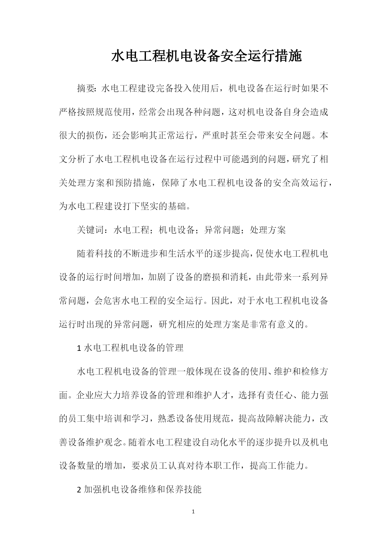 PAGEPAGE7水电工程机电设备安全运行措施摘要:水电工程建设完备投入使用后,机电设备在运行时如果不严格按照规范使用,经常会出现各种问题,这对机电设备自身会造成很大的损伤,还会影响其正常运行,严重时甚至会带来安全问题。本文分析了水电工程机电设备在运行过程中可能遇到的问题,研究了相关处理方案和预防措施,保障了水电工程机电设备的安全高效运行,为水电工程建设打下坚实的基础。关键词:水电工程;机电设备;异常问题;处理方案随着科技的不断进步和生活水平的逐步提高,促使水电工程机电设备的运行时间增加,加剧