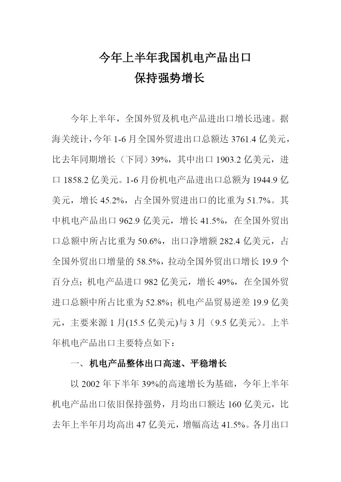 今年上半年我国机电产品出口保持强势增长今年上半年,全国外贸及机电产品进出口增长迅速。据海关统计,今年1-6月全国外贸进出口总额达3761.4亿美元,比去年同期增长(下同)39%,其中出口1903.2亿美元,进口1858.2亿美元。1-6月份机电产品进出口总额为1944.9亿美元,增长45.2%,占全国外贸进出口的比重为51.7%。其中机电产品出口962.9亿美元,增长41.5%,在全国外贸出口总额中所占比重为50.6%,出口净增额282.4亿美元,占全国外贸出口增量的58.5%,拉动全国外贸出口增长19.