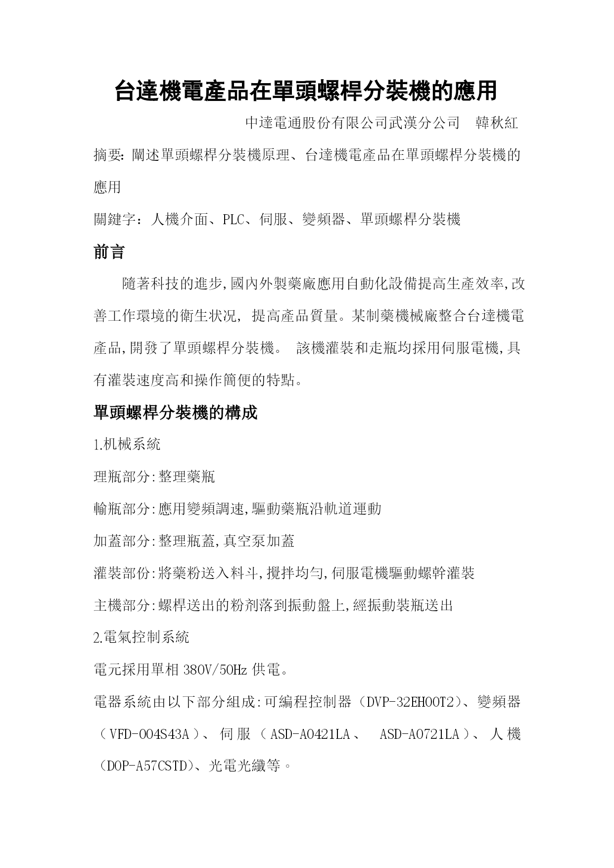 台達機電產品在單頭螺桿分裝機的應用中達電通股份有限公司武漢分公司韓秋紅摘要:闡述單頭螺桿分裝機原理、台達機電產品在單頭螺桿分裝機的應用關鍵字:人機介面、PLC、伺服、變頻器、單頭螺桿分裝機前言隨著科技的進步,國內外製藥廠應用自動化設備提高生產效率,改善工作環境的衛生状况,提高產品質量。某制藥機械廠整合台達機電產品,開發了單頭螺桿分裝機。該機灌裝和走瓶均採用伺服電機,具有灌裝速度高和操作簡便的特點。單頭螺桿分裝機的構成1.机械系統理瓶部分:整理藥瓶輸瓶部分:應用變頻調速,驅動藥瓶沿軌道運動加蓋部分:整理瓶蓋