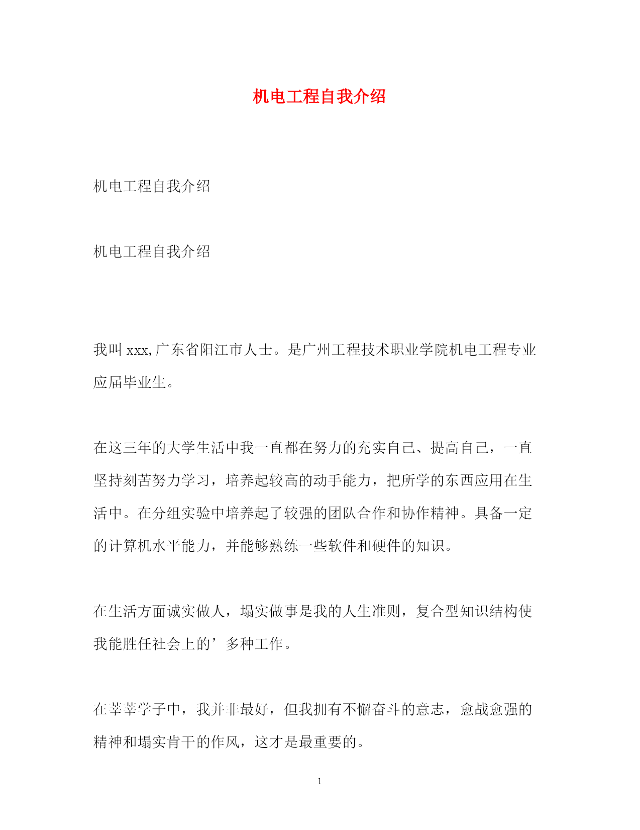 PAGE此资料由网络收集而来,如有侵权请告知上传者立即删除。资料共分享,我们负责传递知识。2020机电大学生自我鉴定大学生一般都会被要求做大学三年自我鉴定,既然是大学生,那么大学生的自我鉴定的要求就会更高,下面我们就去参考一下2020机电大学生自我鉴定的范文,希望对您有帮助,欢迎浏览。在大学三年这个重要阶段,我经历了身心成熟和知识的积累,生活过得充实而有意义。我抱着“全力以赴,做到最好”的宗旨思想品质,知识水平、工作能力方面都有了很大的提高在思想上我不断用先进的理论武装自己的头脑,热爱祖国,拥护中国