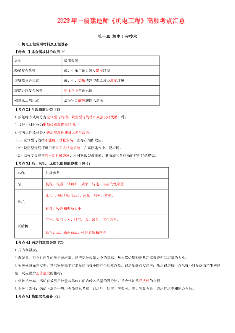 2023年一级建造师《机电工程》高频考点汇总第一章机电工程技术一、机电工程常用材料及工程设备【考点1】非金属板材的应用P9名称适用范围酚醛复合风管低、中压空调系统及潮湿环境聚氨酯复合风管低、中、高压洁净空调系统及潮湿环境玻璃纤维复合风管中压以下空调系统硬聚氯乙烯风管洁净室含酸碱的排风系统【考点2】母线槽的分类P151.按绝缘方式可分为空气型母线槽、紧密型母线槽和高强度母线槽三种;2.按导电材料分为铜母线槽和铝母线槽;3.按防火性能可分为普通母线槽和耐火型母线槽。(1)空气型母线槽不能用于垂直安装,因存在烟