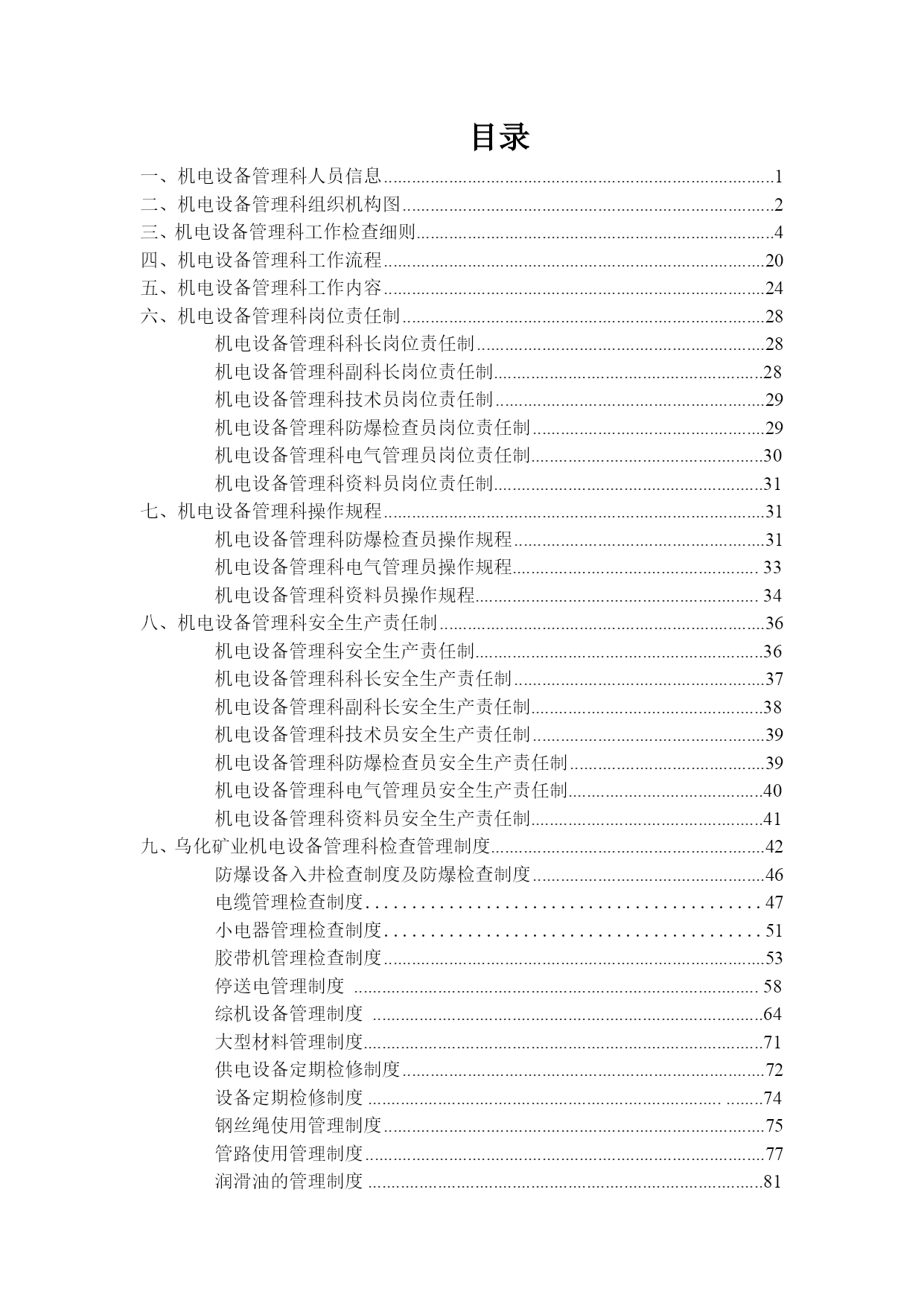 目录TOC\o"1-3"\h\uHYPERLINK\l_Toc30384一、机电设备管理科人员信息PAGEREF_Toc303841HYPERLINK\l_Toc29158二、机电设备管理科组织机构图2三、机电设备管理科工作检查细则.............................................................................4HYPERLINK\l_Toc24003四、机电设备管理科工作流程20HYPERLINK\l
