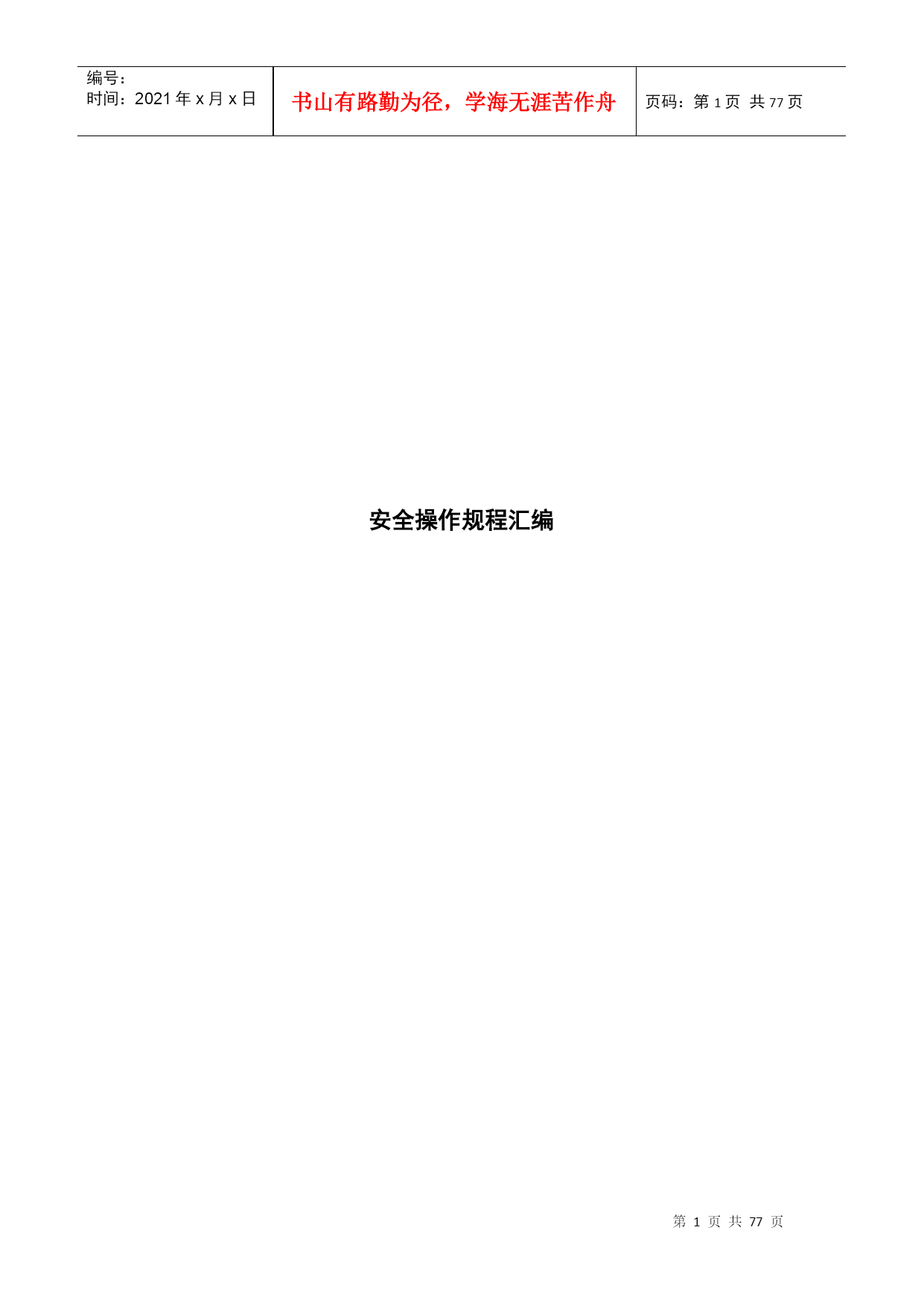 编号:时间:2021年x月x日书山有路勤为径,学海无涯苦作舟页码:第PAGE77页共NUMPAGES77页第PAGE\*MERGEFORMAT77页共NUMPAGES\*MERGEFORMAT77页安全操作规程汇编机电运输区二〇一一年目录变电所安全操作规程3变电所安全工作规程4变电所检修操作规程5开关重合闸规程6AGF606-1.92-1.3-2型主扇风机操作规程7AGF606-1.92-1.3-2型主扇风机反风操作规程8BD-Ⅱ-8-NO29型主扇风机操作规程9BD-Ⅱ-8-NO