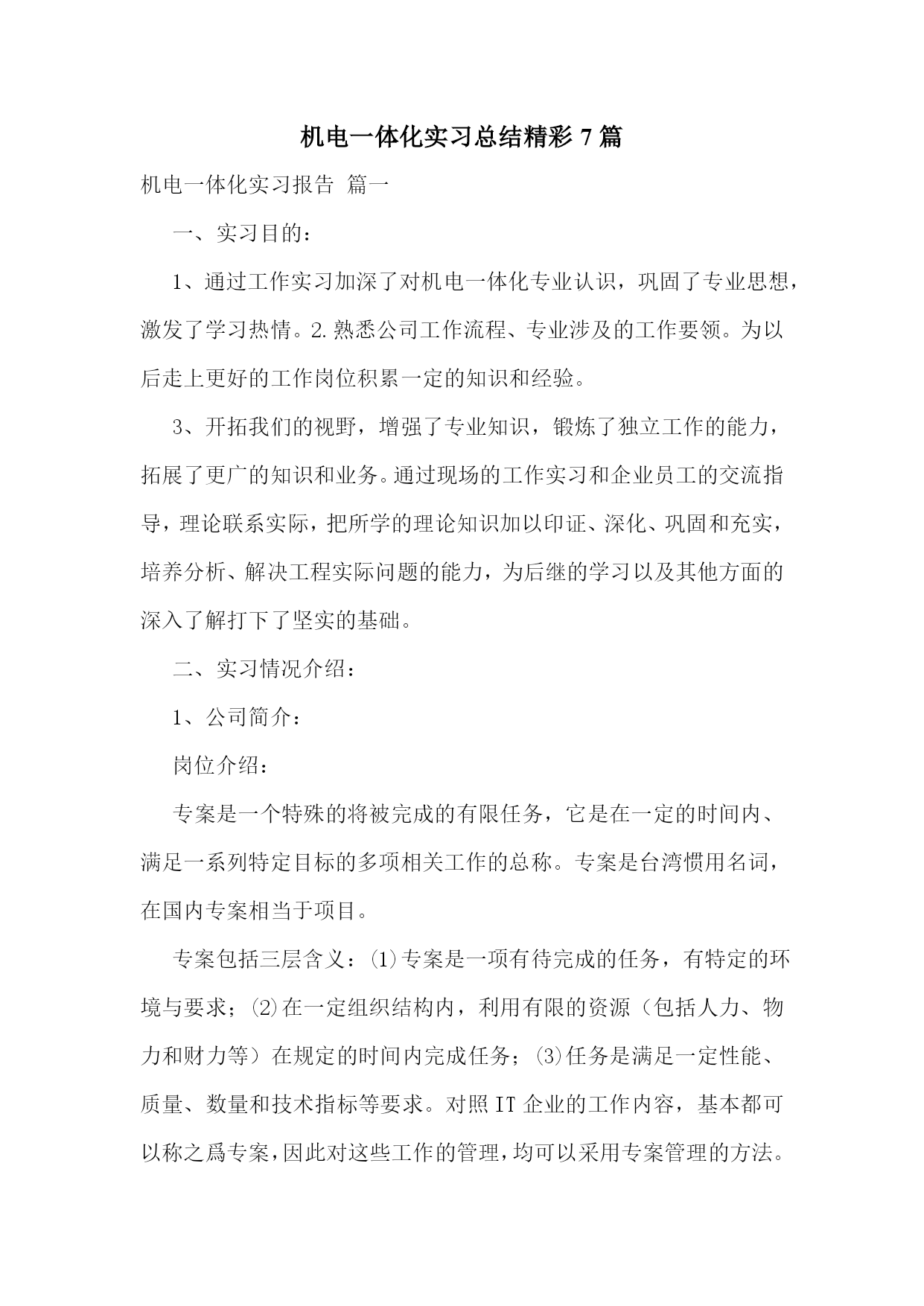 机电一体化实习总结精彩7篇机电一体化实习报告篇一一、实习目的:1、通过工作实习加深了对机电一体化专业认识,巩固了专业思想,激发了学习热情。2.熟悉公司工作流程、专业涉及的工作要领。为以后走上更好的工作岗位积累一定的知识和经验。3、开拓我们的视野,增强了专业知识,锻炼了独立工作的能力,拓展了更广的知识和业务。通过现场的工作实习和企业员工的交流指导,理论联系实际,把所学的理论知识加以印证、深化、巩固和充实,培养分析、解决工程实际问题的能力,为后继的学习以及其他方面的深入了解打下了坚实的基础。二、实习情况介绍: