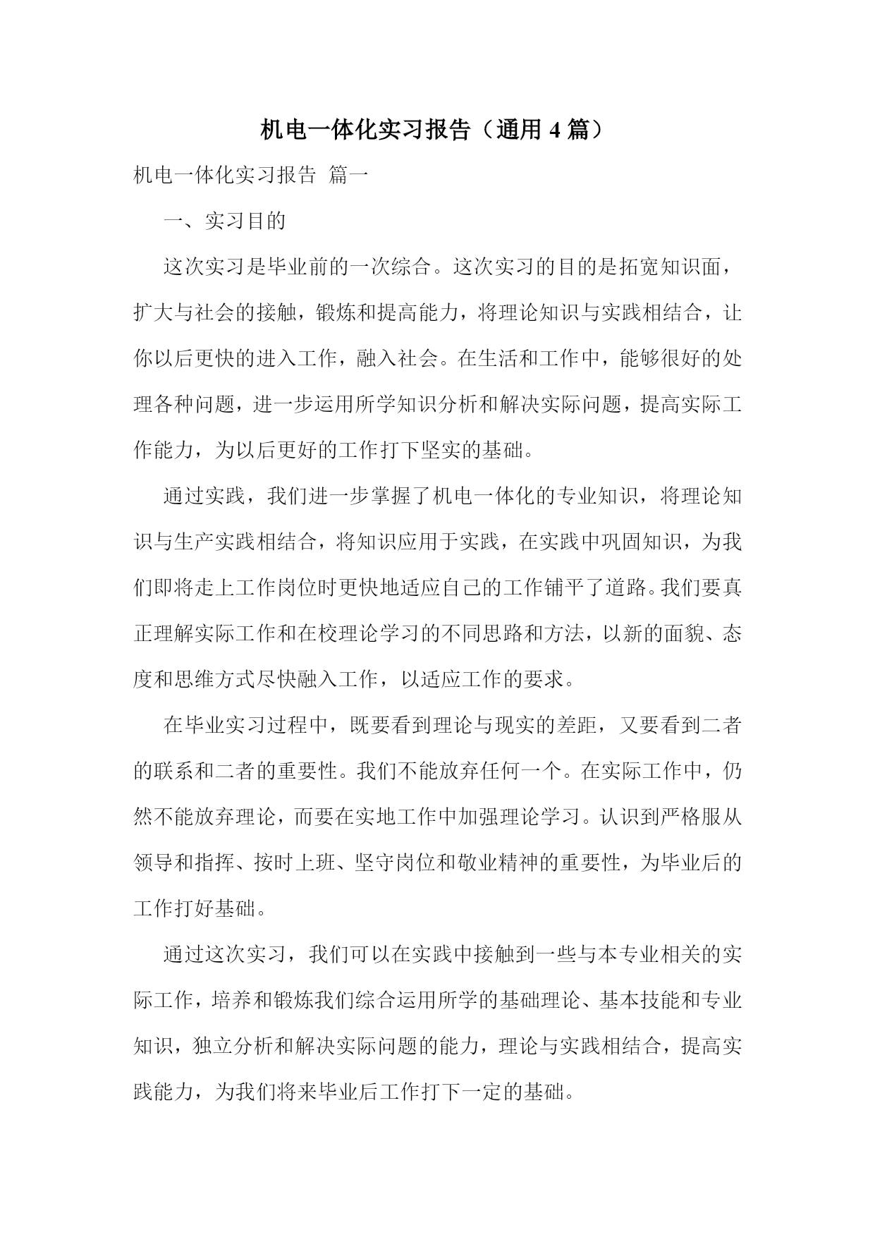 机电一体化实习报告(通用4篇)机电一体化实习报告篇一一、实习目的这次实习是毕业前的一次综合。这次实习的目的是拓宽知识面,扩大与社会的接触,锻炼和提高能力,将理论知识与实践相结合,让你以后更快的进入工作,融入社会。在生活和工作中,能够很好的处理各种问题,进一步运用所学知识分析和解决实际问题,提高实际工作能力,为以后更好的工作打下坚实的基础。通过实践,我们进一步掌握了机电一体化的专业知识,将理论知识与生产实践相结合,将知识应用于实践,在实践中巩固知识,为我们即将走上工作岗位时更快地适应自己的工作铺平了道路。我