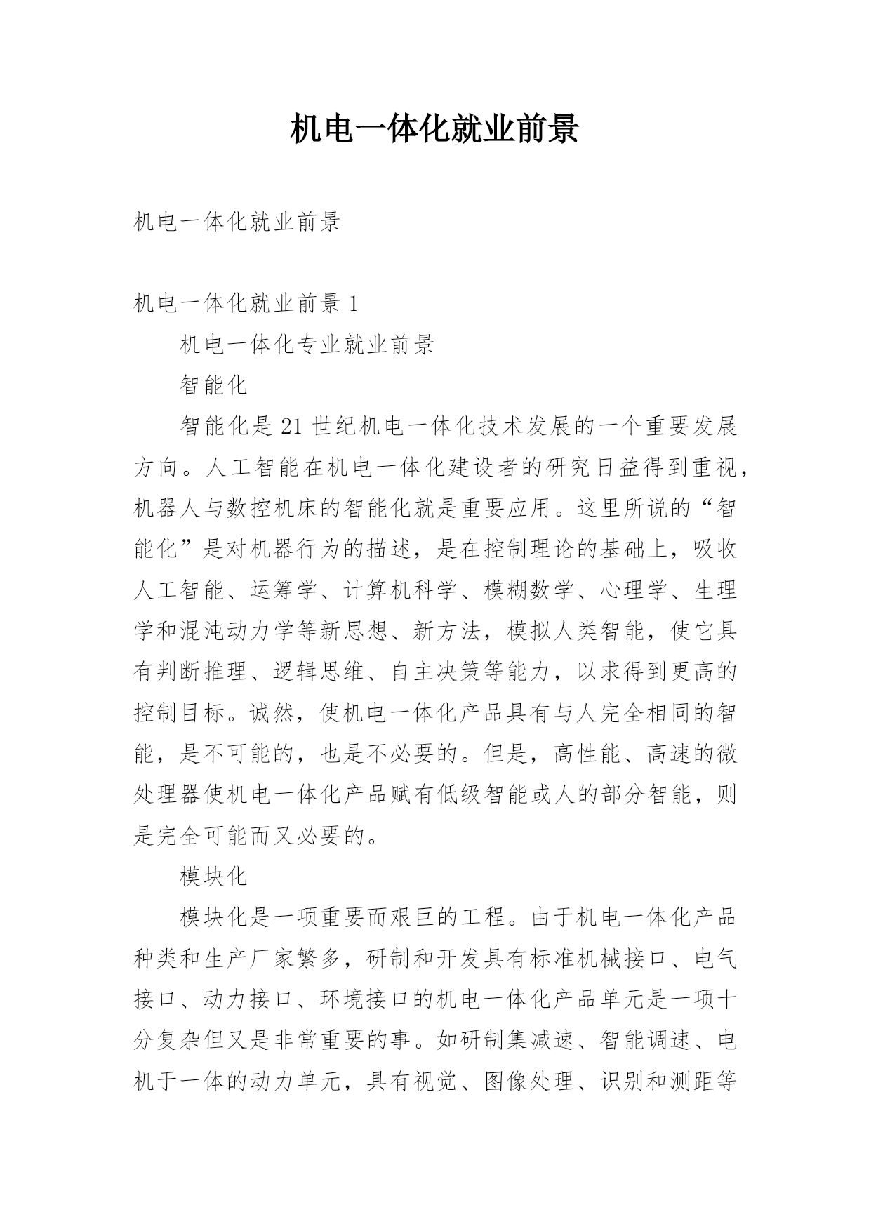 机电一体化就业前景机电一体化就业前景机电一体化就业前景1机电一体化专业就业前景智能化智能化是21世纪机电一体化技术发展的一个重要发展方向。人工智能在机电一体化建设者的研究日益得到重视,机器人与数控机床的智能化就是重要应用。这里所说的“智能化”是对机器行为的描述,是在控制理论的基础上,吸收人工智能、运筹学、计算机科学、模糊数学、心理学、生理学和混沌动力学等新思想、新方法,模拟人类智能,使它具有判断推理、逻辑思维、自主决策等能力,以求得到更高的控制目标。诚然,使机电一体化产品具有与人完全相同的智能,是不可能的