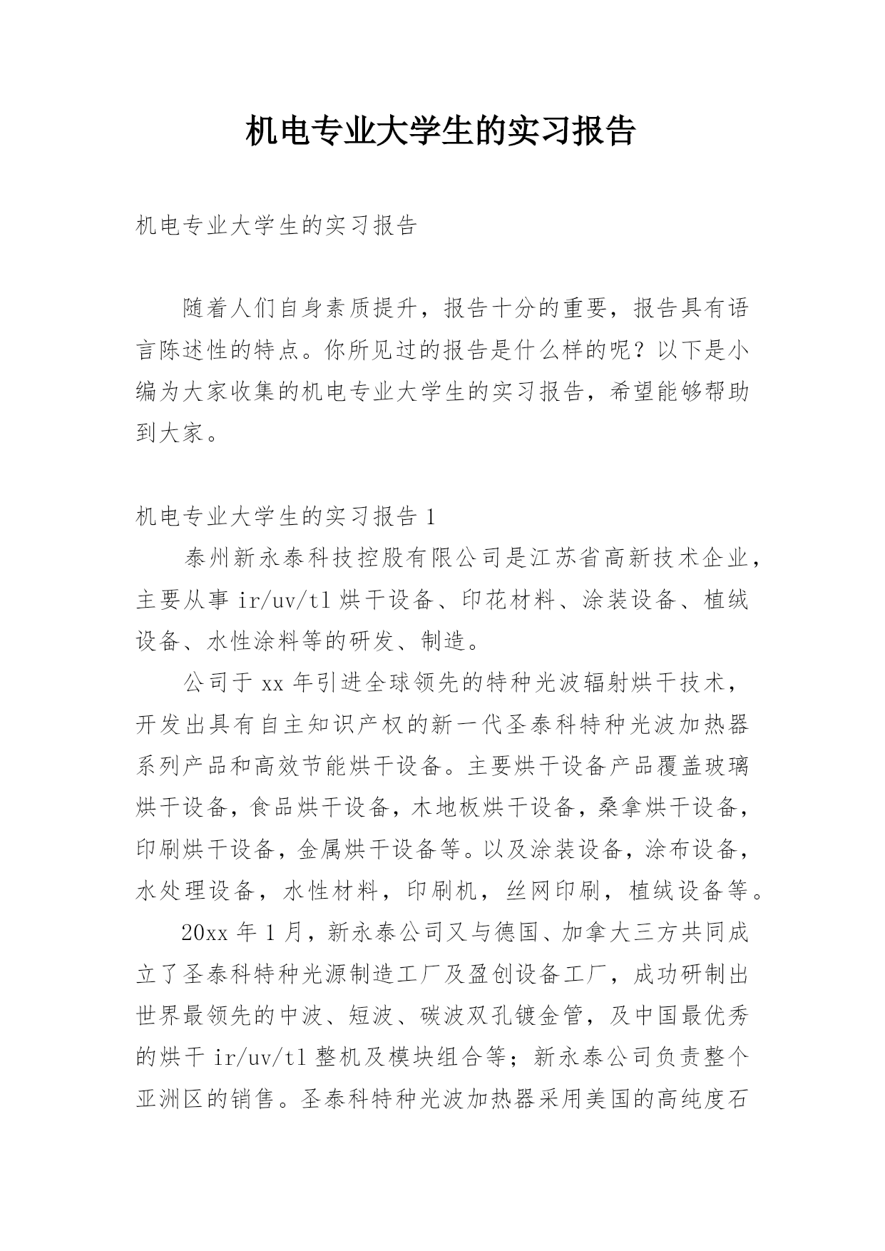 机电专业大学生的实习报告机电专业大学生的实习报告随着人们自身素质提升,报告十分的重要,报告具有语言陈述性的特点。你所见过的报告是什么样的呢?以下是小编为大家收集的机电专业大学生的实习报告,希望能够帮助到大家。机电专业大学生的实习报告1泰州新永泰科技控股有限公司是江苏省高新技术企业,主要从事ir/uv/tl烘干设备、印花材料、涂装设备、植绒设备、水性涂料等的研发、制造。公司于xx年引进全球领先的特种光波辐射烘干技术,开发出具有自主知识产权的新一代圣泰科特种光波加热器系列产品和高效节能烘干设备。主要烘干设备产