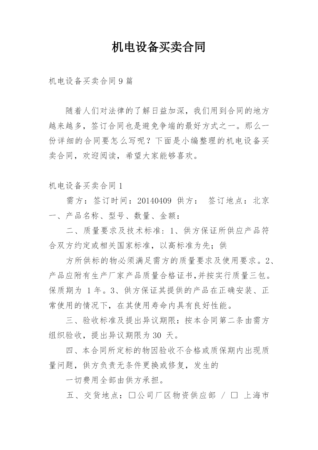 机电设备买卖合同机电设备买卖合同9篇随着人们对法律的了解日益加深,我们用到合同的地方越来越多,签订合同也是避免争端的最好方式之一。那么一份详细的合同要怎么写呢?下面是小编整理的机电设备买卖合同,欢迎阅读,希望大家能够喜欢。机电设备买卖合同1需方:签订时间:20140409供方:签订地点:北京一、产品名称、型号、数量、金额:二、质量要求及技术标准:1、供方保证所供应产品符合双方约定或相关国家标准,以高标准为先;供方所供标的物必须满足需方的质量要求及使用要求。2、产品应附有生产厂家产品质量合格证书,并按实行质