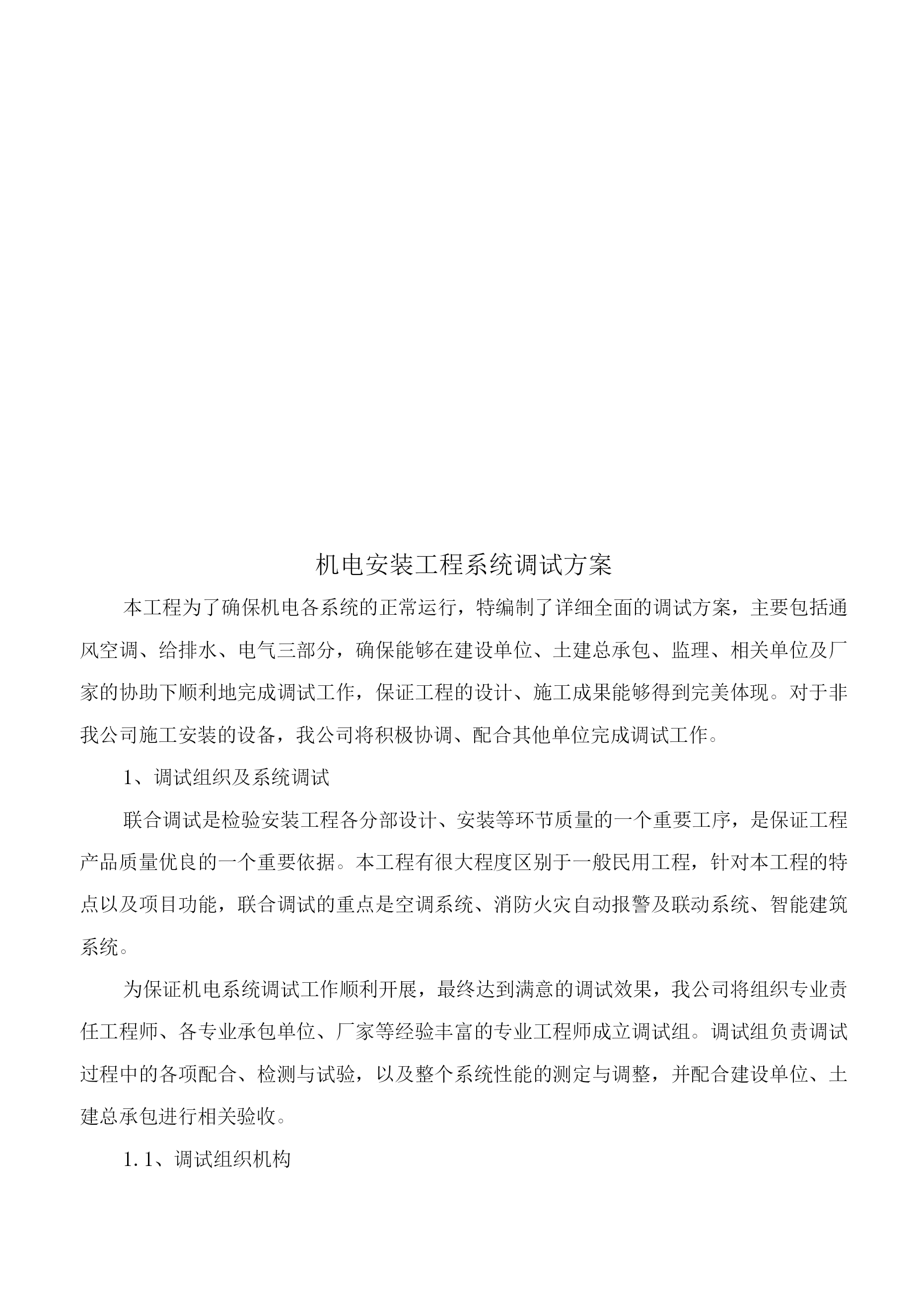 机电安装工程系统调试方案本工程为了确保机电各系统的正常运行,特编制了详细全面的调试方案,主要包括通风空调、给排水、电气三部分,确保能够在建设单位、土建总承包、监理、相关单位及厂家的协助下顺利地完成调试工作,保证工程的设计、施工成果能够得到完美体现。对于非我公司施工安装的设备,我公司将积极协调、配合其他单位完成调试工作。1、调试组织及系统调试联合调试是检验安装工程各分部设计、安装等环节质量的一个重要工序,是保证工程产品质量优良的一个重要依据。本工程有很大程度区别于一般民用工程,针对本工程的特点以及项目功能,