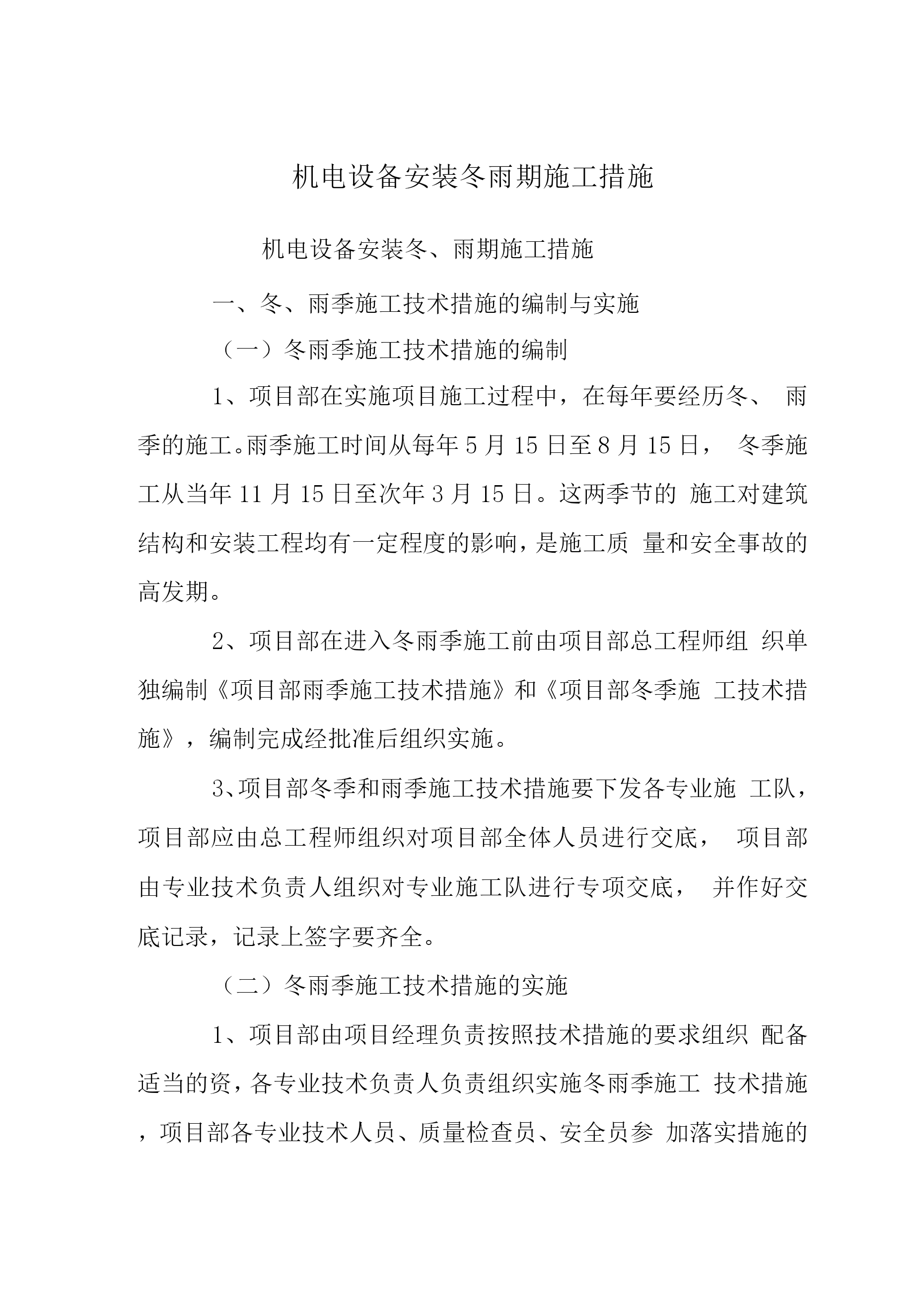 机电设备安装冬雨期施工措施机电设备安装冬、雨期施工措施一、冬、雨季施工技术措施的编制与实施(一)冬雨季施工技术措施的编制1、项目部在实施项目施工过程中,在每年要经历冬、雨季的施工。雨季施工时间从每年5月15日至8月15日,冬季施工从当年11月15日至次年3月15日。这两季节的施工对建筑结构和安装工程均有一定程度的影响,是施工质量和安全事故的高发期。2、项目部在进入冬雨季施工前由项目部总工程师组织单独编制《项目部雨季施工技术措施》和《项目部冬季施工技术措施》,编制完成经批准后组织实施。3、项目部冬季和雨季施
