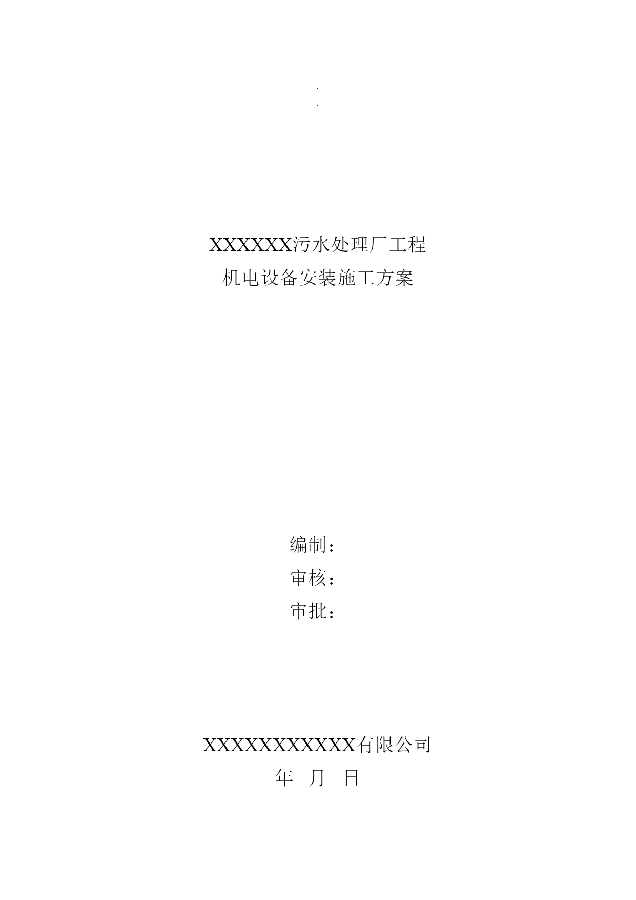 ..XXXXXX污水处理厂工程机电设备安装施工方案编制:审核:审批:XXXXXXXXXXX有限公司年月日XXXXX污水处理厂一期工程机电设备安装施工方案工程概况本工程涉及深圳市燕川污水处理厂一期工程各构筑物内机电设备安装与调试,主要设备有粗格栅、细格栅、螺旋输送机、水泵、启闭机、闸门、起重设备、搅拌装置、曝气设备、刮泥机、污泥浓缩脱水机、鼓风设备、开关柜及配电柜。方案编制依据《城市污水处理厂工程质量验收规范》GB50334-2002《现场设备、工业管道焊接工程施工及验收规范》GB50236-98《建筑电气