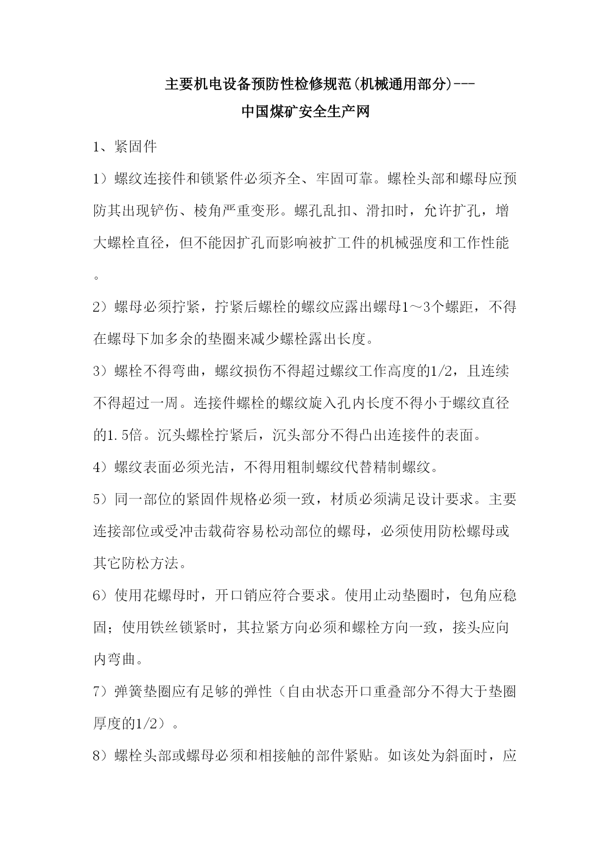 主要机电设备预防性检修规范(机械通用部分)---中国煤矿安全生产网1、紧固件1)螺纹连接件和锁紧件必须齐全、牢固可靠。螺栓头部和螺母应预防其出现铲伤、棱角严重变形。螺孔乱扣、滑扣时,允许扩孔,增大螺栓直径,但不能因扩孔而影响被扩工件的机械强度和工作性能。2)螺母必须拧紧,拧紧后螺栓的螺纹应露出螺母1~3个螺距,不得在螺母下加多余的垫圈来减少螺栓露出长度。3)螺栓不得弯曲,螺纹损伤不得超过螺纹工作高度的1/2,且连续不得超过一周。连接件螺栓的螺纹旋入孔内长度不得小于螺纹直径的1.5倍。沉头螺栓拧紧后,沉头部