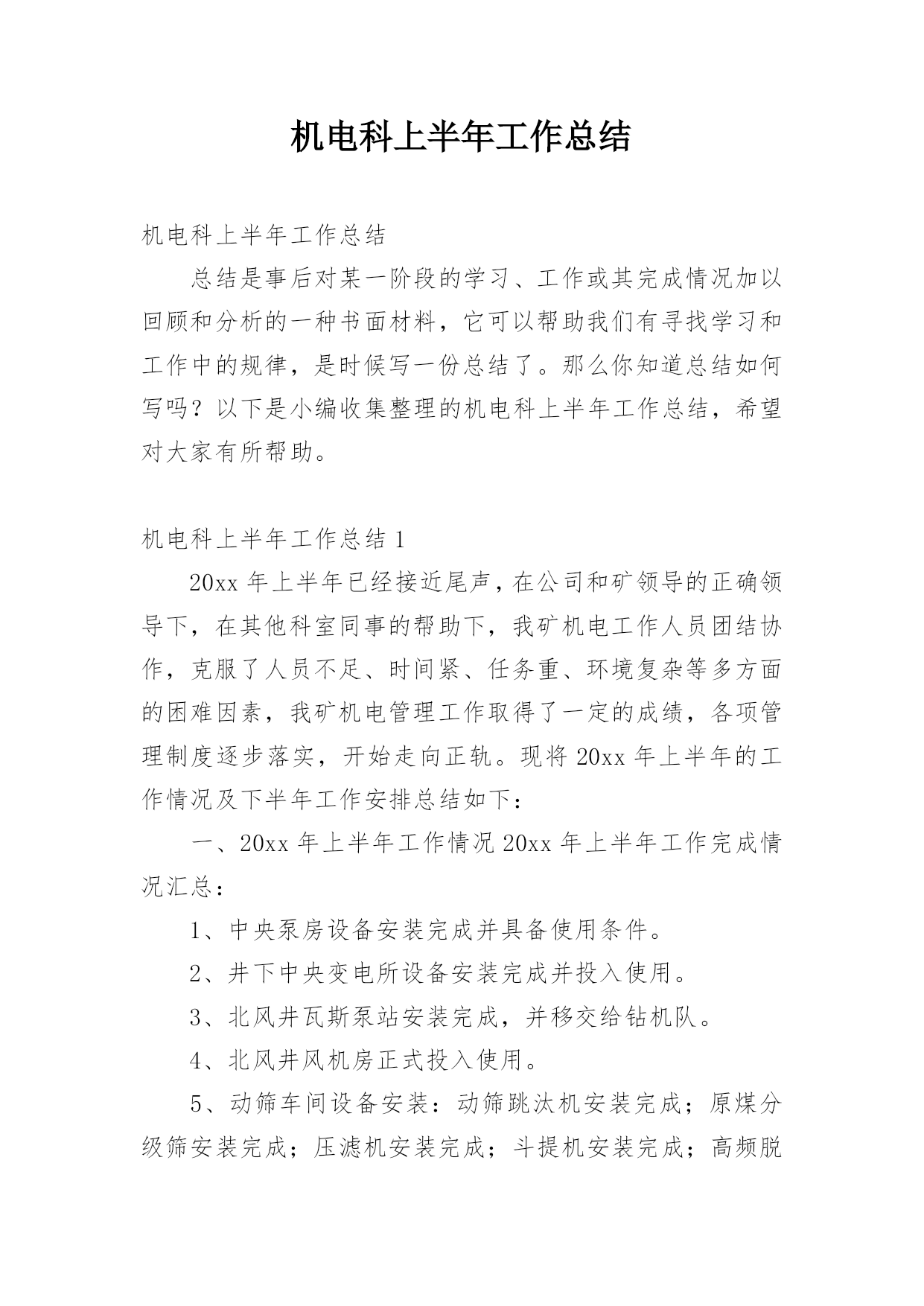 机电科上半年工作总结机电科上半年工作总结总结是事后对某一阶段的学习、工作或其完成情况加以回顾和分析的一种书面材料,它可以帮助我们有寻找学习和工作中的规律,是时候写一份总结了。那么你知道总结如何写吗?以下是小编收集整理的机电科上半年工作总结,希望对大家有所帮助。机电科上半年工作总结120xx年上半年已经接近尾声,在公司和矿领导的正确领导下,在其他科室同事的帮助下,我矿机电工作人员团结协作,克服了人员不足、时间紧、任务重、环境复杂等多方面的困难因素,我矿机电管理工作取得了一定的成绩,各项管理制度逐步落实,开始