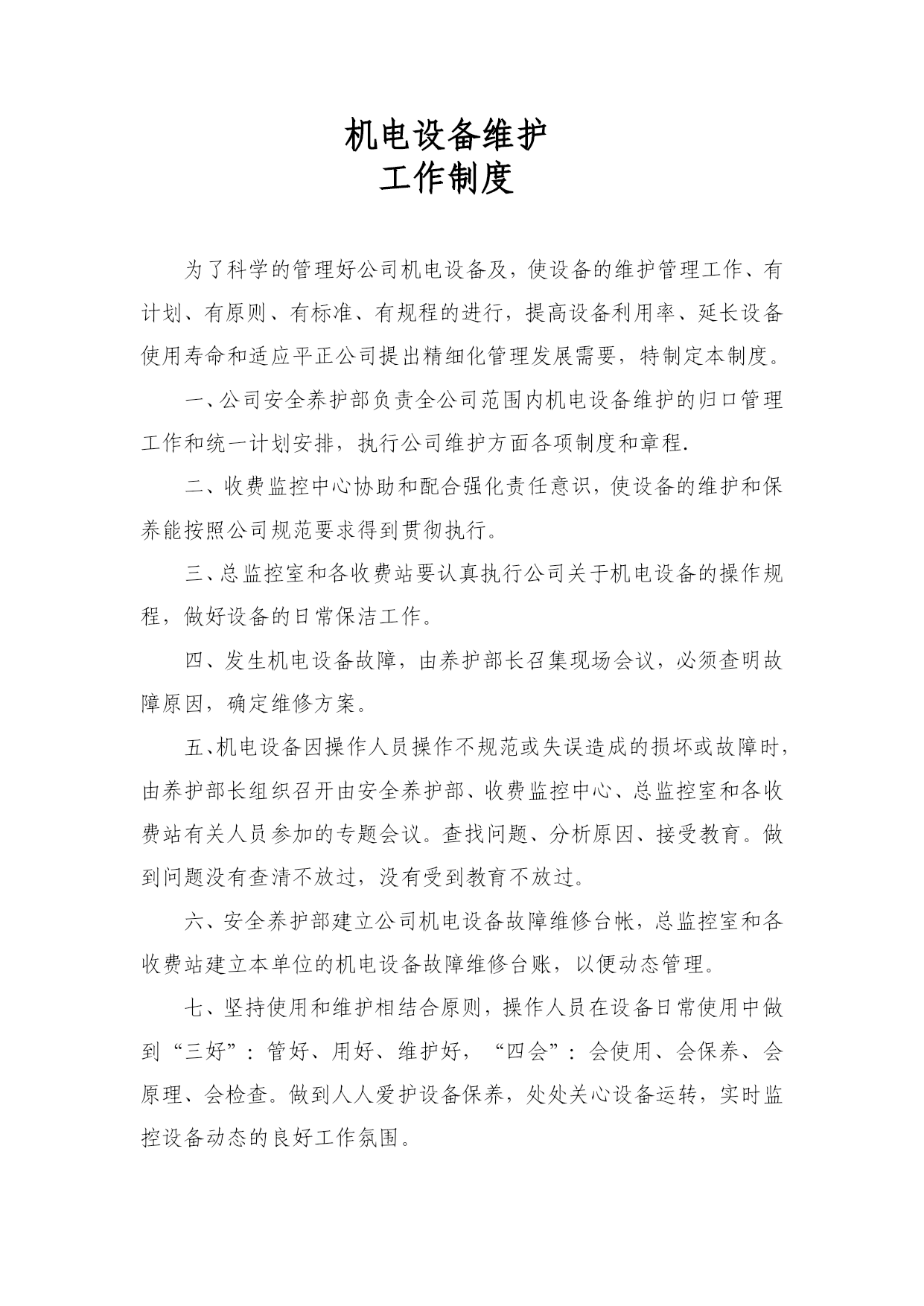 机电设备维护工作制度为了科学的管理好公司机电设备及,使设备的维护管理工作、有计划、有原则、有标准、有规程的进行,提高设备利用率、延长设备使用寿命和适应平正公司提出精细化管理发展需要,特制定本制度。一、公司安全养护部负责全公司范围内机电设备维护的归口管理工作和统一计划安排,执行公司维护方面各项制度和章程.二、收费监控中心协助和配合强化责任意识,使设备的维护和保养能按照公司规范要求得到贯彻执行。三、总监控室和各收费站要认真执行公司关于机电设备的操作规程,做好设备的日常保洁工作。四、发生机电设备故障,由养护部长