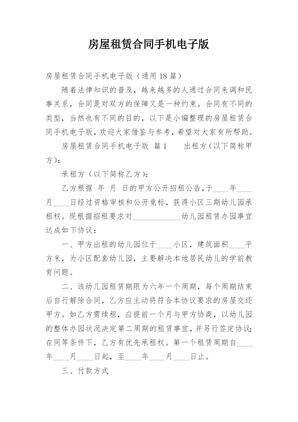 房屋租赁合同手机电子版房屋租赁合同手机电子版(通用18篇)随着法律知识的普及,越来越多的人通过合同来调和民事关系,合同是对双方的保障又是一种约束。合同有不同的类型,当然也有不同的目的,以下是小编整理的房屋租赁合同手机电子版,欢迎大家借鉴与参考,希望对大家有所帮助。房屋租赁合同手机电子版篇1出租方(以下简称甲方):承租方(以下简称乙方):乙方根据年月日的甲方公开招租公告,于____年____月____日经过资格审核和公开竞标,获得小区三期幼儿园承租权。现根据招租要求对____________幼儿园租赁办园事