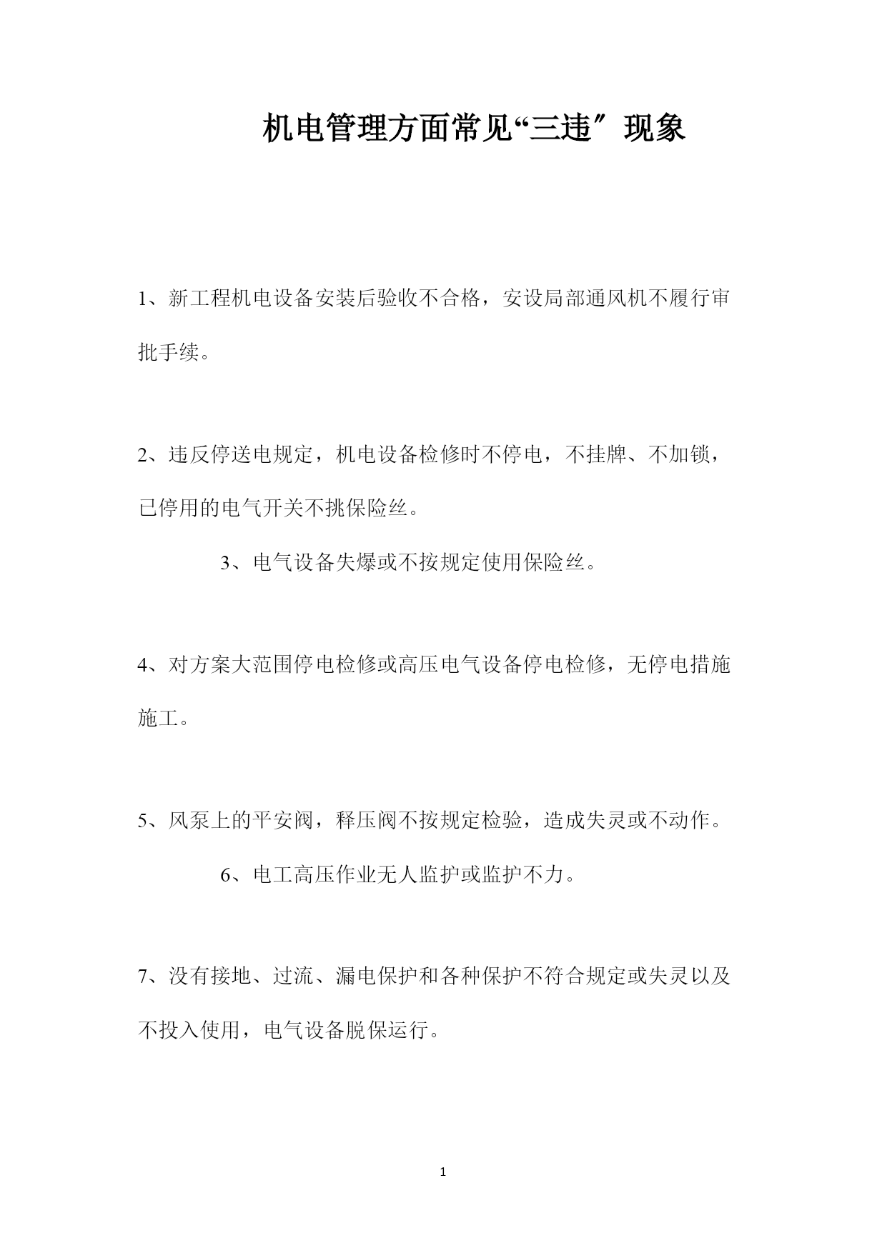 PAGEPAGE5机电管理方面常见“三违〞现象1、新工程机电设备安装后验收不合格,安设局部通风机不履行审批手续。2、违反停送电规定,机电设备检修时不停电,不挂牌、不加锁,已停用的电气开关不挑保险丝。3、电气设备失爆或不按规定使用保险丝。4、对方案大范围停电检修或高压电气设备停电检修,无停电措施施工。5、风泵上的平安阀,释压阀不按规定检验,造成失灵或不动作。6、电工高压作业无人监护或监护不力。7、没有接地、过流、漏电保护和各种保护不符合规定或失灵以及不投入使用,电气设备脱保运行。8、接地线丧失没