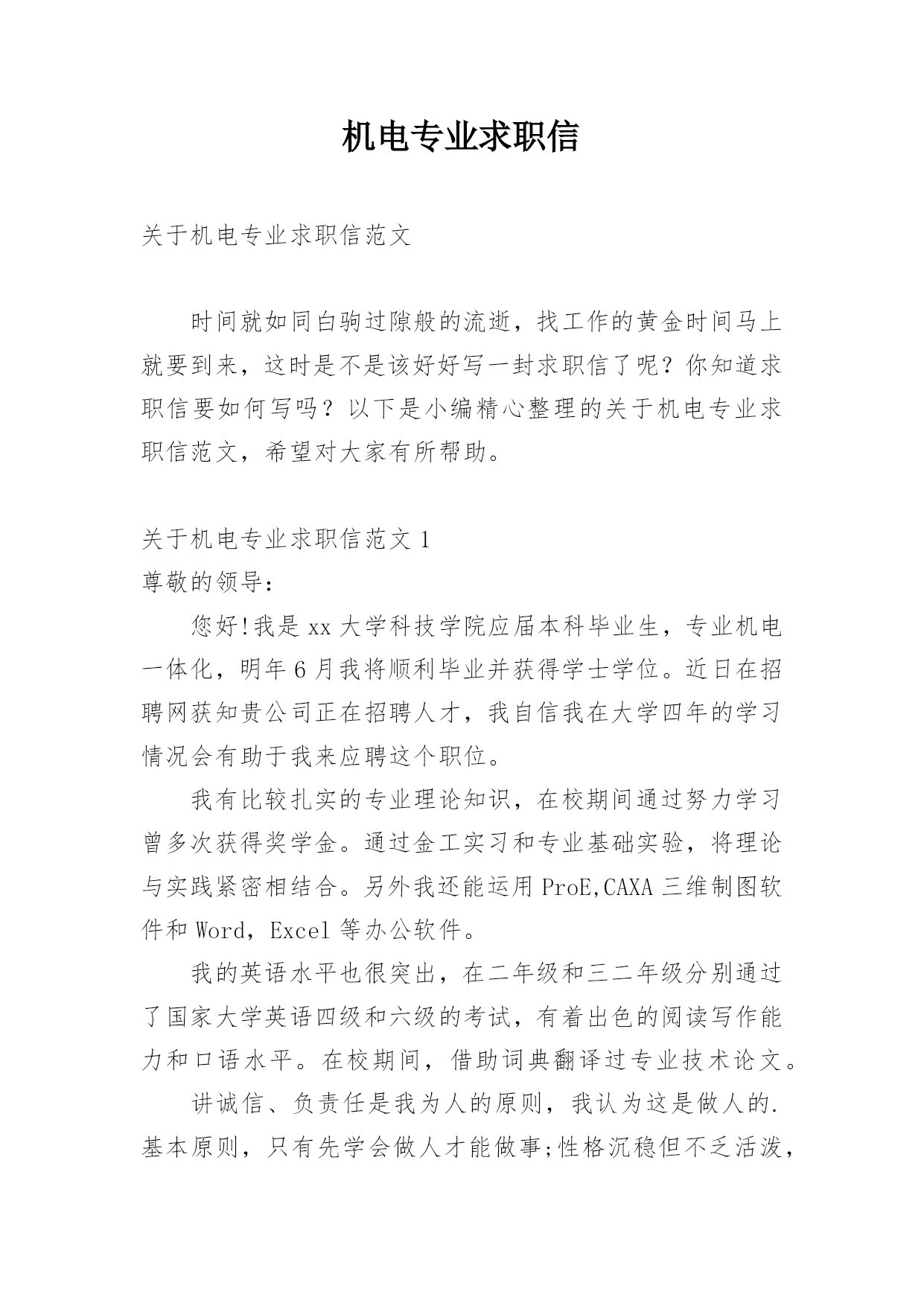 机电专业求职信关于机电专业求职信范文时间就如同白驹过隙般的流逝,找工作的黄金时间马上就要到来,这时是不是该好好写一封求职信了呢?你知道求职信要如何写吗?以下是小编精心整理的关于机电专业求职信范文,希望对大家有所帮助。关于机电专业求职信范文1尊敬的领导:您好!我是xx大学科技学院应届本科毕业生,专业机电一体化,明年6月我将顺利毕业并获得学士学位。近日在招聘网获知贵公司正在招聘人才,我自信我在大学四年的学习情况会有助于我来应聘这个职位。我有比较扎实的专业理论知识,在校期间通过努力学习曾多次获得奖学金。通过金工