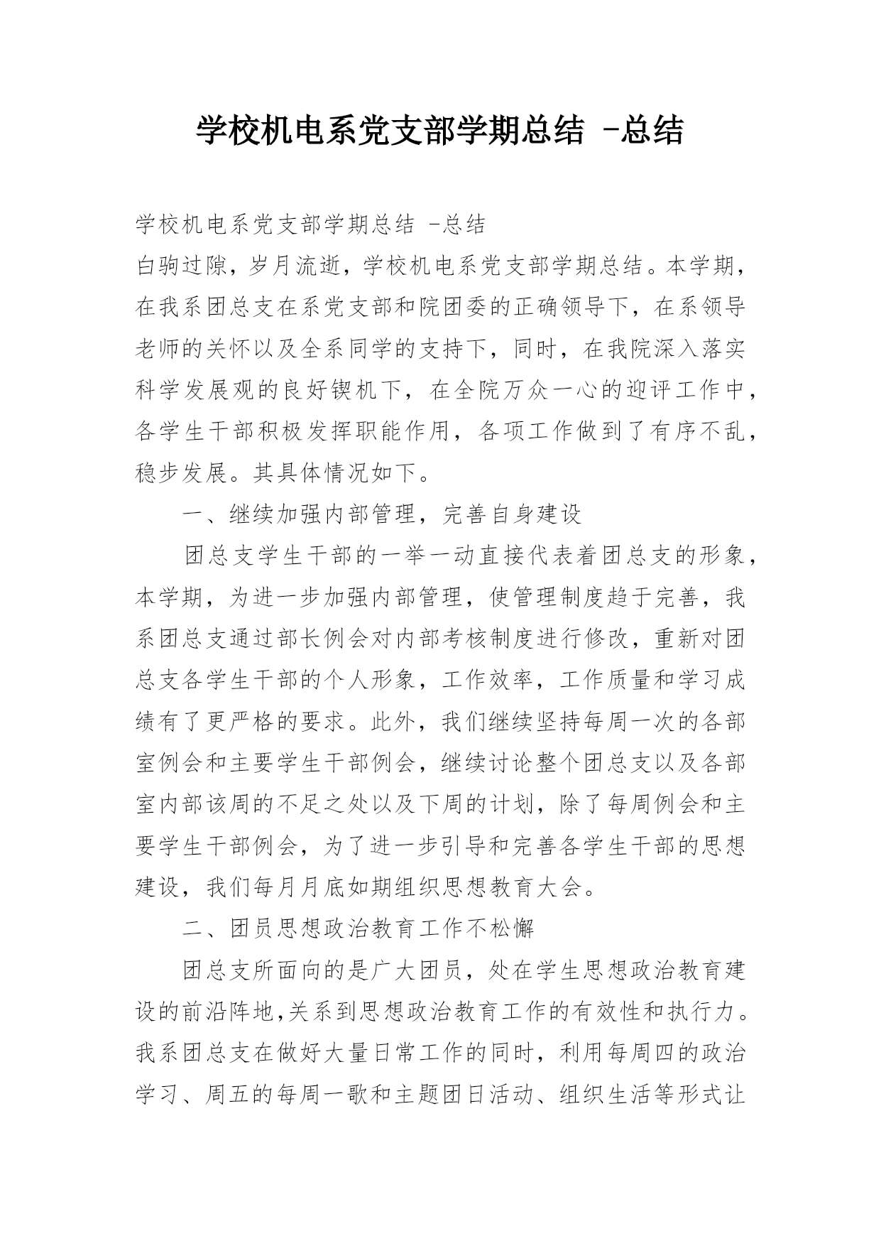 学校机电系党支部学期总结-总结学校机电系党支部学期总结-总结白驹过隙,岁月流逝,学校机电系党支部学期总结。本学期,在我系团总支在系党支部和院团委的正确领导下,在系领导老师的关怀以及全系同学的支持下,同时,在我院深入落实科学发展观的良好锲机下,在全院万众一心的迎评工作中,各学生干部积极发挥职能作用,各项工作做到了有序不乱,稳步发展。其具体情况如下。一、继续加强内部管理,完善自身建设团总支学生干部的一举一动直接代表着团总支的形象,本学期,为进一步加强内部管理,使管理制度趋于完善,我系团总支通过部长例会对内部考
