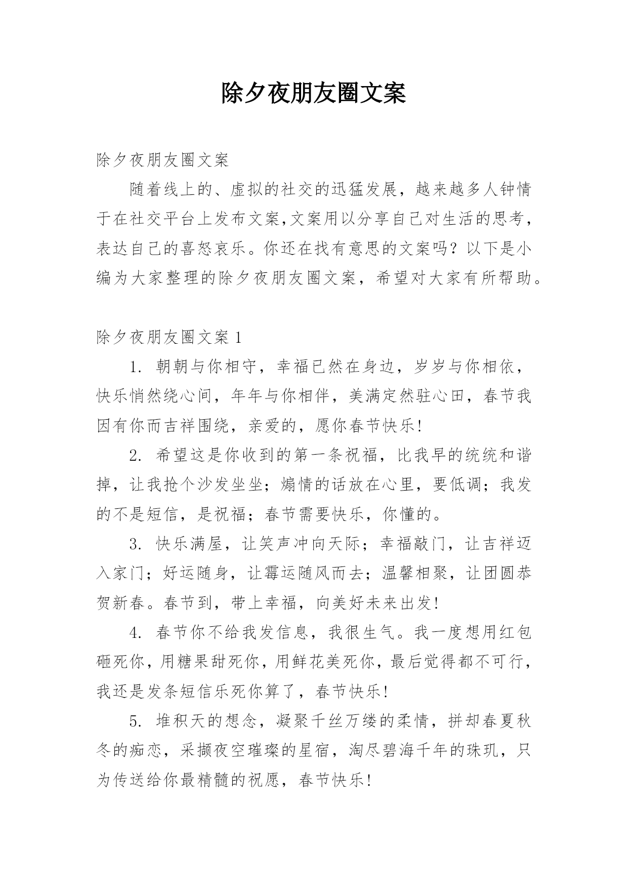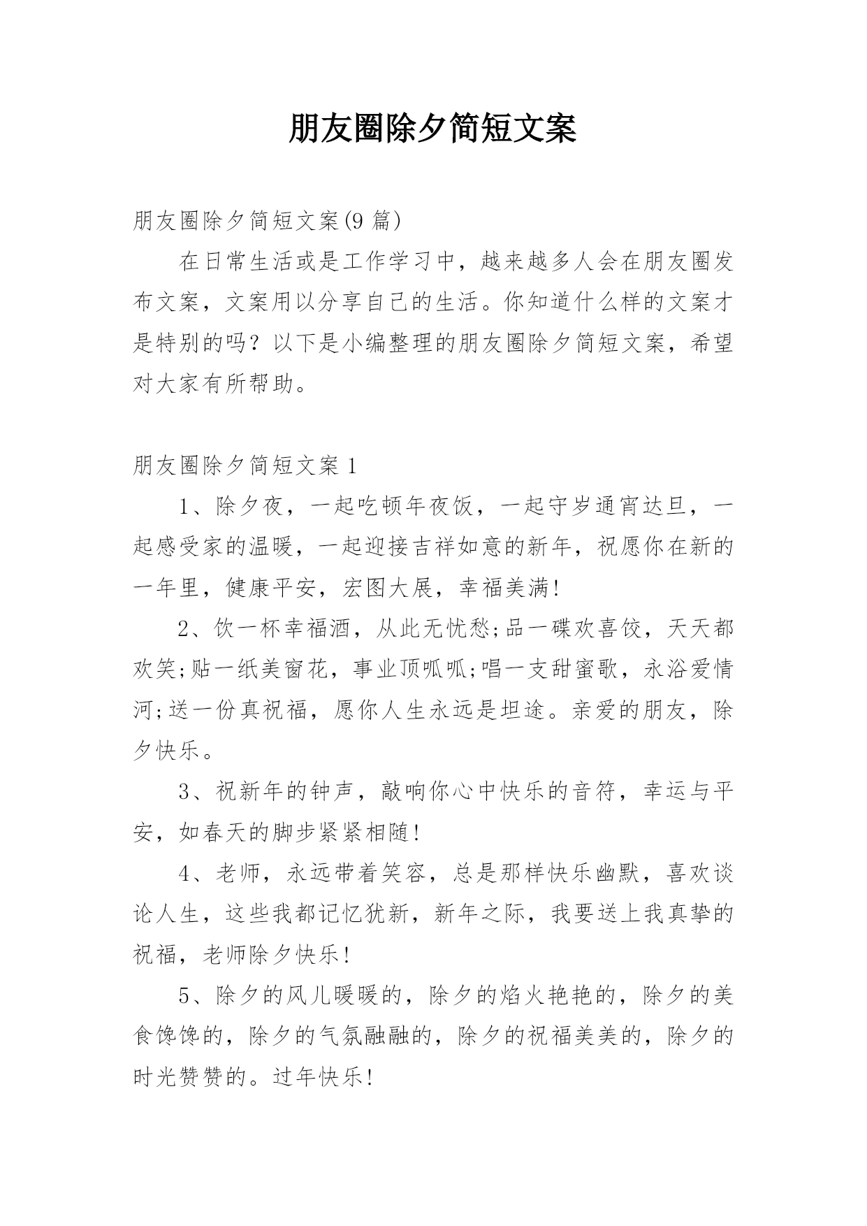 朋友圈除夕简短文案朋友圈除夕简短文案(9篇)在日常生活或是工作学习中,越来越多人会在朋友圈发布文案,文案用以分享自己的生活。你知道什么样的文案才是特别的吗?以下是小编整理的朋友圈除夕简短文案,希望对大家有所帮助。朋友圈除夕简短文案11、除夕夜,一起吃顿年夜饭,一起守岁通宵达旦,一起感受家的温暖,一起迎接吉祥如意的新年,祝愿你在新的一年里,健康平安,宏图大展,幸福美满!2、饮一杯幸福酒,从此无忧愁;品一碟欢喜饺,天天都欢笑;贴一纸美窗花,事业顶呱呱;唱一支甜蜜歌,永浴爱情河;送一份真祝福,愿你人生永远是坦途