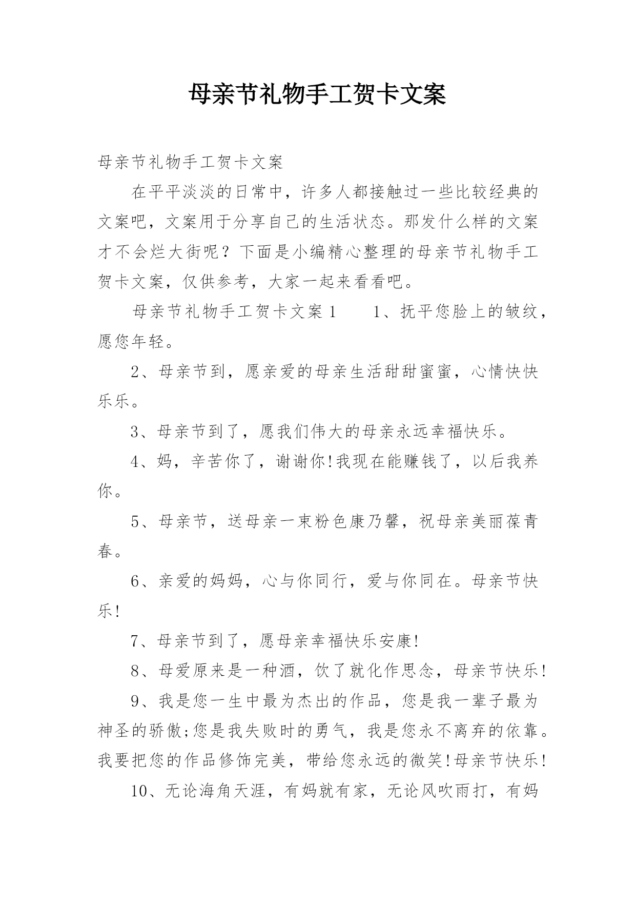 母亲节礼物手工贺卡文案母亲节礼物手工贺卡文案在平平淡淡的日常中,许多人都接触过一些比较经典的文案吧,文案用于分享自己的生活状态。那发什么样的文案才不会烂大街呢?下面是小编精心整理的母亲节礼物手工贺卡文案,仅供参考,大家一起来看看吧。母亲节礼物手工贺卡文案11、抚平您脸上的皱纹,愿您年轻。2、母亲节到,愿亲爱的母亲生活甜甜蜜蜜,心情快快乐乐。3、母亲节到了,愿我们伟大的母亲永远幸福快乐。4、妈,辛苦你了,谢谢你!我现在能赚钱了,以后我养你。5、母亲节,送母亲一束粉色康乃馨,祝母亲美丽葆青春。6、亲爱的妈妈,