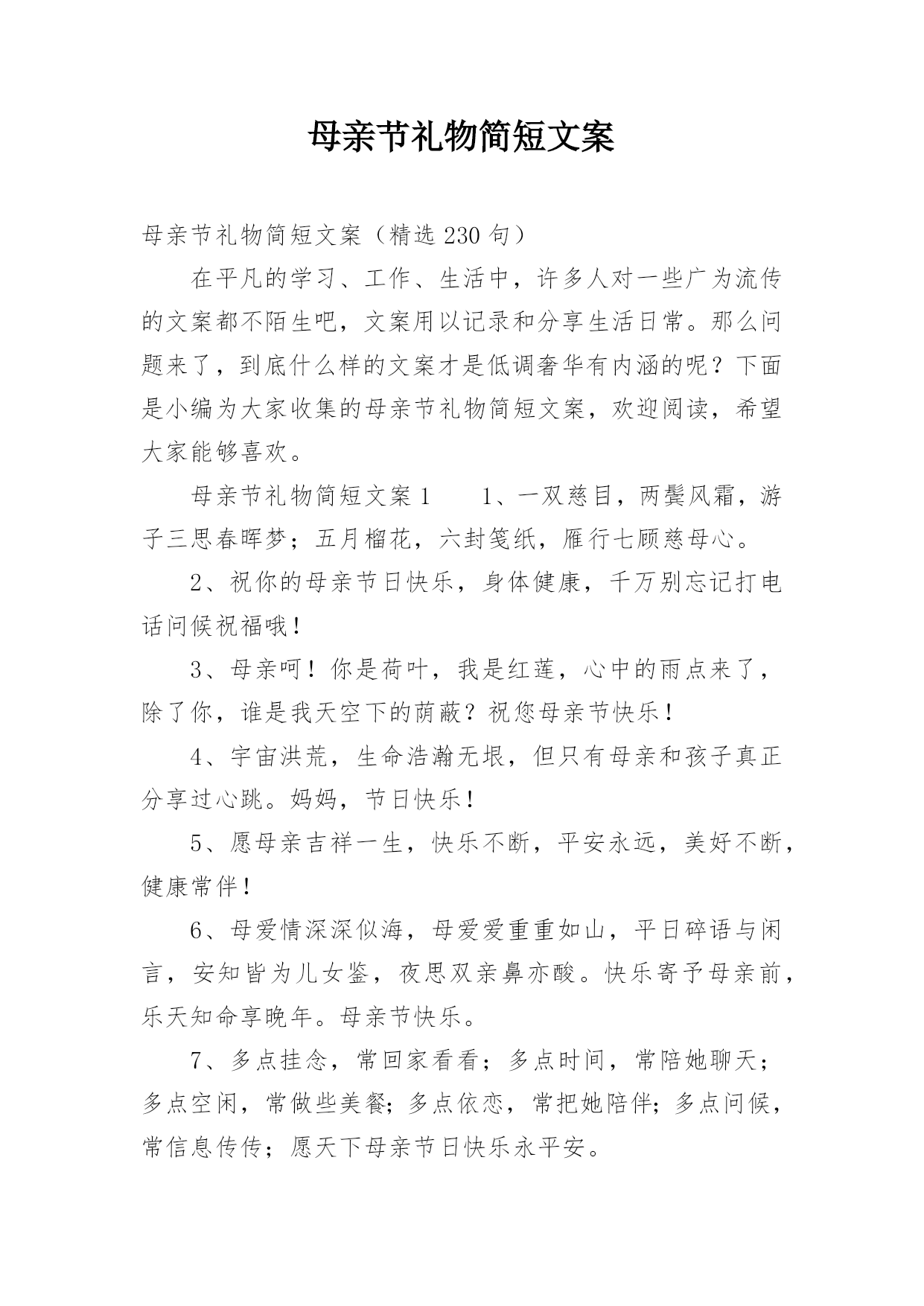 母亲节礼物简短文案母亲节礼物简短文案(精选230句)在平凡的学习、工作、生活中,许多人对一些广为流传的文案都不陌生吧,文案用以记录和分享生活日常。那么问题来了,到底什么样的文案才是低调奢华有内涵的呢?下面是小编为大家收集的母亲节礼物简短文案,欢迎阅读,希望大家能够喜欢。母亲节礼物简短文案11、一双慈目,两鬓风霜,游子三思春晖梦;五月榴花,六封笺纸,雁行七顾慈母心。2、祝你的母亲节日快乐,身体健康,千万别忘记打电话问候祝福哦!3、母亲呵!你是荷叶,我是红莲,心中的雨点来了,除了你,谁是我天空下的荫蔽?祝您母