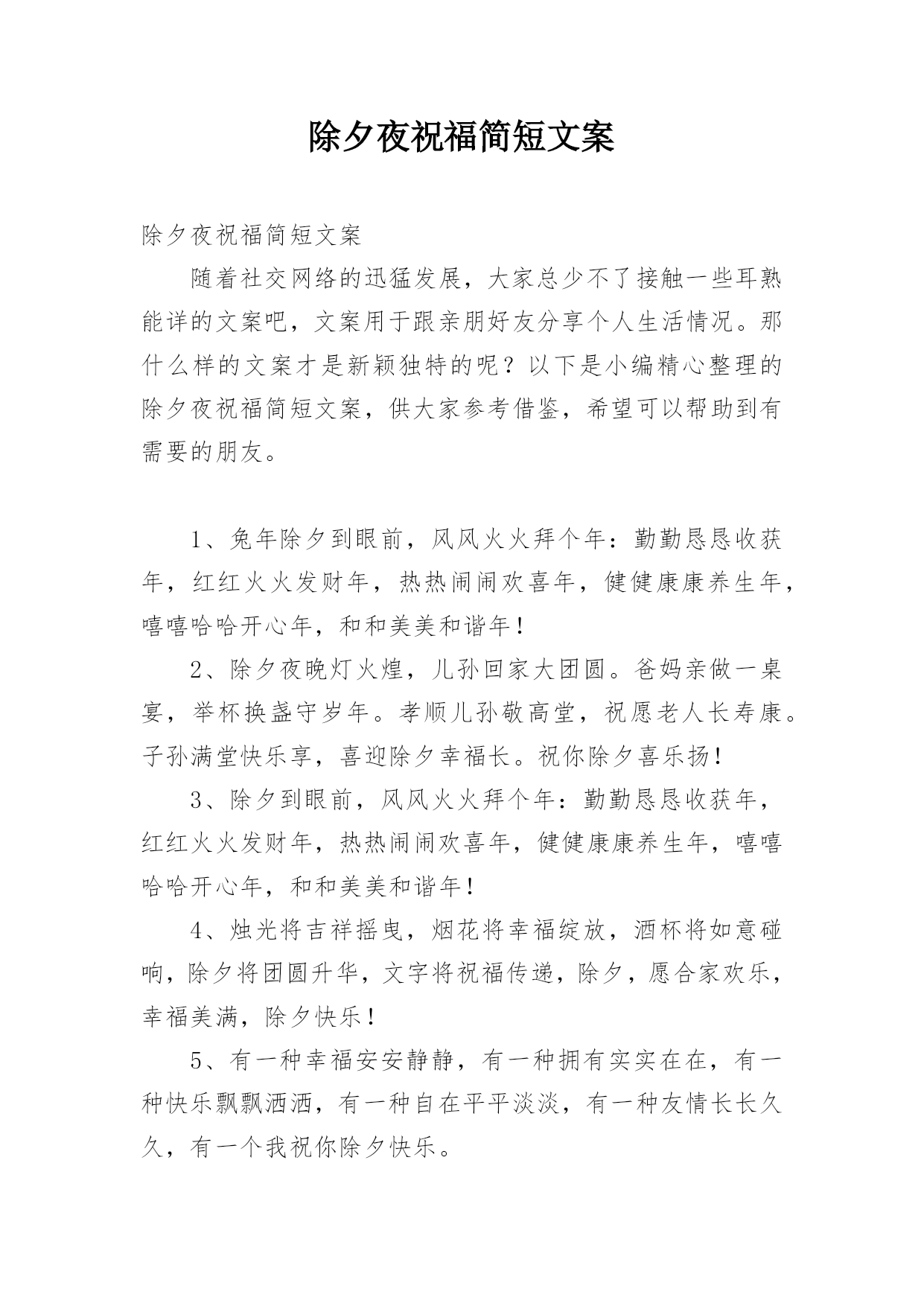 除夕夜祝福简短文案除夕夜祝福简短文案随着社交网络的迅猛发展,大家总少不了接触一些耳熟能详的文案吧,文案用于跟亲朋好友分享个人生活情况。那什么样的文案才是新颖独特的呢?以下是小编精心整理的除夕夜祝福简短文案,供大家参考借鉴,希望可以帮助到有需要的朋友。1、兔年除夕到眼前,风风火火拜个年:勤勤恳恳收获年,红红火火发财年,热热闹闹欢喜年,健健康康养生年,嘻嘻哈哈开心年,和和美美和谐年!2、除夕夜晚灯火煌,儿孙回家大团圆。爸妈亲做一桌宴,举杯换盏守岁年。孝顺儿孙敬高堂,祝愿老人长寿康。子孙满堂快乐享,喜迎除夕幸福
